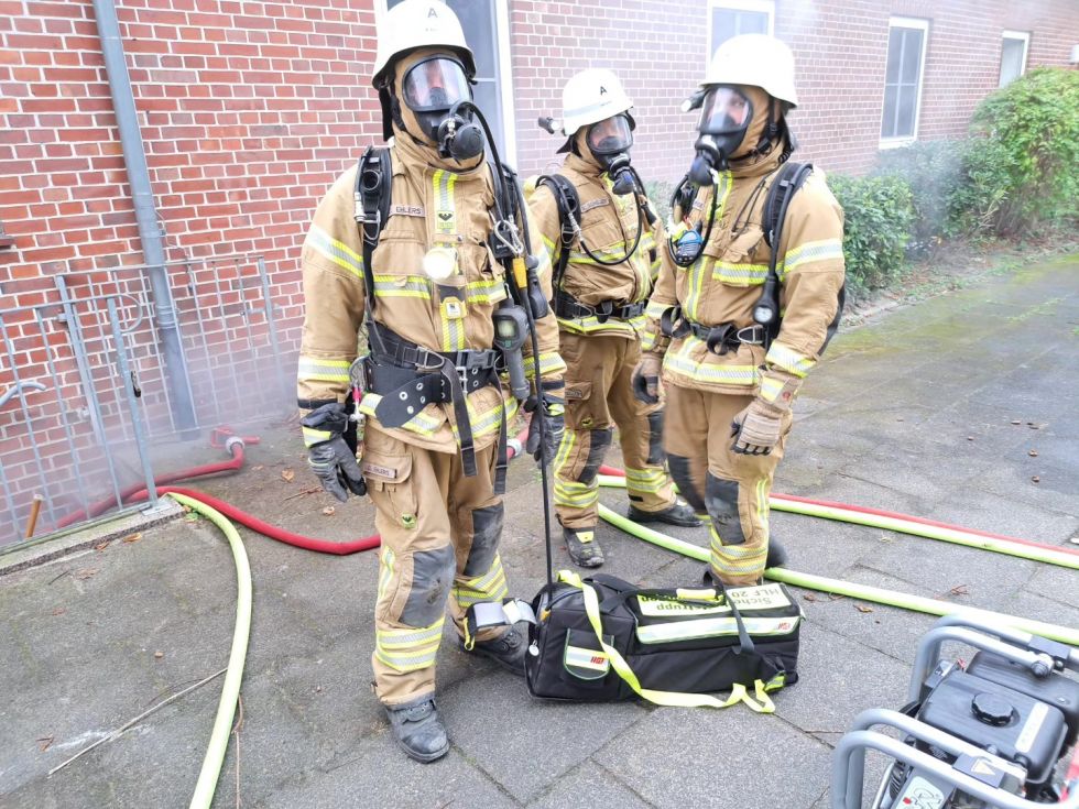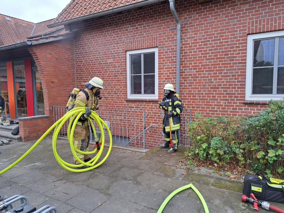 (mh) Der eigentliche Dienst in der Brandsimulationsanlage in Schneeheide musste aufgrund eines technischen Defekts in die Räumlichkeiten der Grundschule Düshorn verlegt werden. Der Hausmeister und Feuerwehrkamerad Thomas Reichstein unterstützte dabei. In den von Mirco Zurovskis und Carsten Küddelsmann vorbereiteten Einsatzübungen lag der Fokus auf dem Vorgehen in Kellerräumen und der dortigen Menschenrettung.