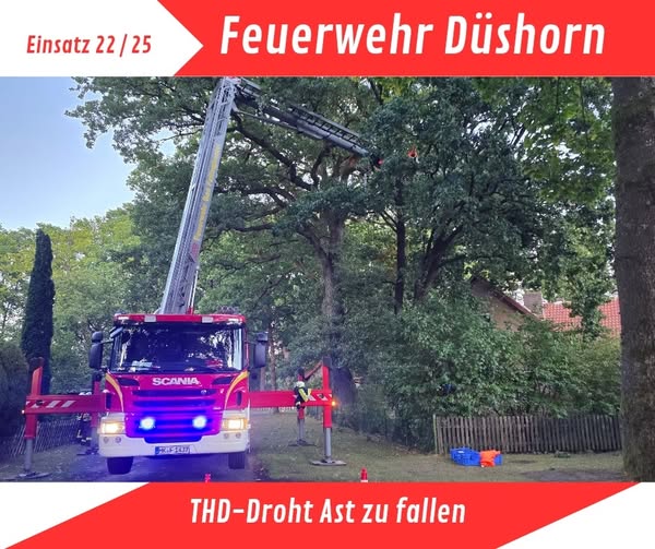 (mh) Am Montagabend wurde der Ortsbrandmeister telefonisch über einen drohenden Astbruch direkt über einem Wohnhaus in Bockhorn informiert. Da er sich mit einigen Kameraden am Feuerwehrhaus befand, konnte zügig zur Lageerkundung ausgerückt werden. An der Einsatzstelle wurde schnell festgestellt, dass ein Hubrettungsgerät benötigt wird. Daraufhin wurde die Feuerwehr Bad Fallingbostel zur Unterstützung alarmiert. Die betroffenen Äste des Baumes wurden aus dem Korb des Teleskopgelenkmastes entfernt.