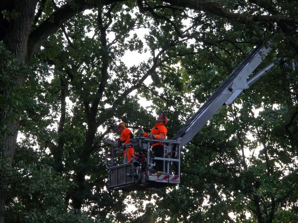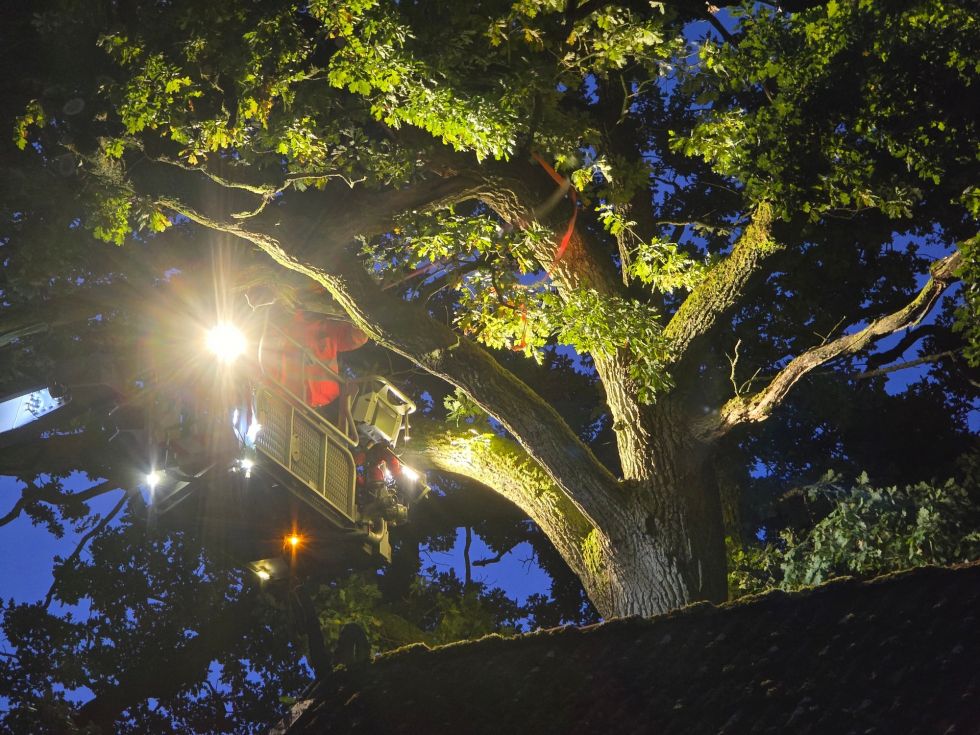 (mh) Am Montagabend wurde der Ortsbrandmeister telefonisch über einen drohenden Astbruch direkt über einem Wohnhaus in Bockhorn informiert. Da er sich mit einigen Kameraden am Feuerwehrhaus befand, konnte zügig zur Lageerkundung ausgerückt werden. An der Einsatzstelle wurde schnell festgestellt, dass ein Hubrettungsgerät benötigt wird. Daraufhin wurde die Feuerwehr Bad Fallingbostel zur Unterstützung alarmiert. Die betroffenen Äste des Baumes wurden aus dem Korb des Teleskopgelenkmastes entfernt.