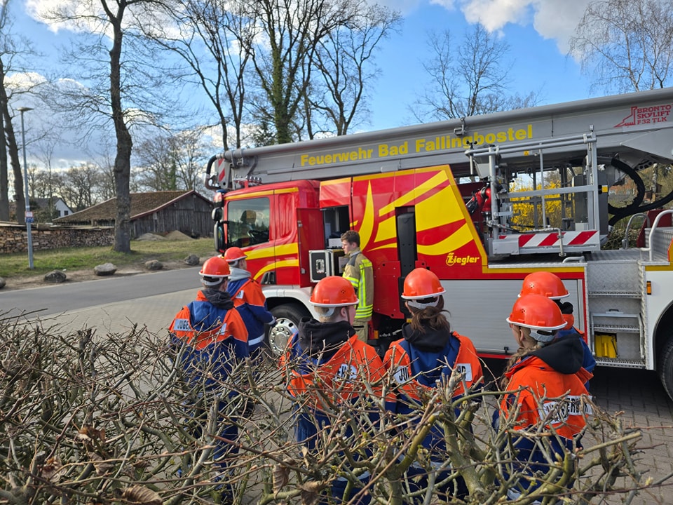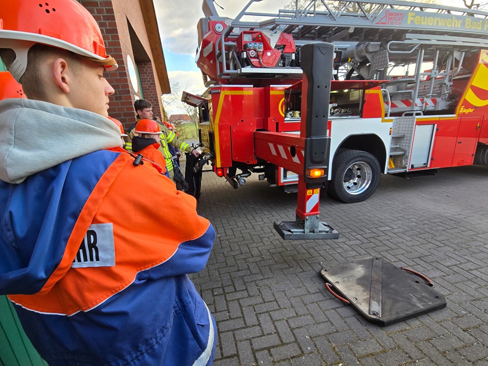 (mh) Beim letzten Dienst der Jugendfeuerwehr vor den Osterferien stand das Thema „Leitern“ auf dem Dienstplan. Nach einer kurzen Theorieeinheit, in der auf die verschiedenen Arten von Leitern in der Feuerwehr eingegangen wurde, unteranderem die vierteilige Steckleiter vom eigenem Fahrzeug, folgte eine Fahrzeugkunde. Passend zum Dienst hatte sich der Teleskopgelenkmast aus Bad Fallingbostel vor dem Feuerwehrhaus in Stellung gebracht.