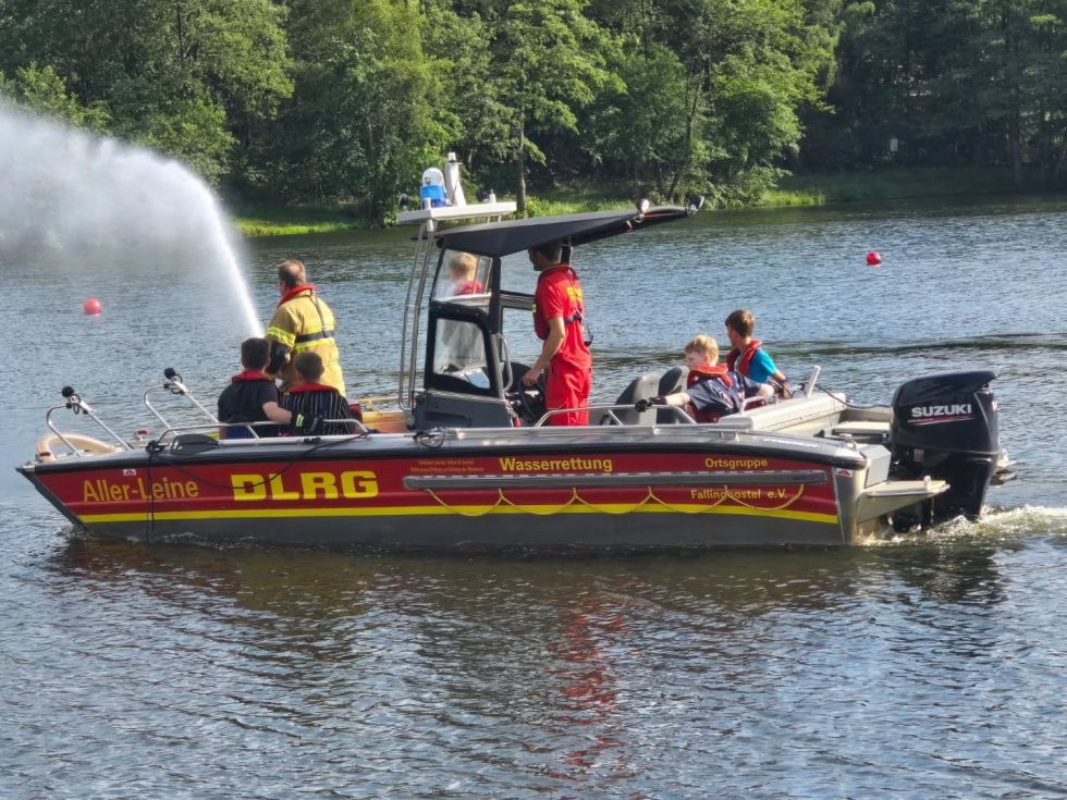 Neben der Fahrzeugkunde wurde das Boot kurzerhand zu einem „Löschboot“ umgerüstet. Vom Löschgruppenfahrzeug wurde die tragbare Pumpe umgeladen. So wurde vom Wasser aus der „brennende" Eisberg gelöscht. Zum Abschluss folgte eine kurze Vorführung einer Strömungsretterin die bei voller Fahrt vom Boot sprang. Schönen Dank an das DLRG Ortsgruppe Fallingbostel e.V. , dem Strandbad Düshorn sowie dem Verständnis der Sauna-Gäste für diese Möglichkeit des Dienst.