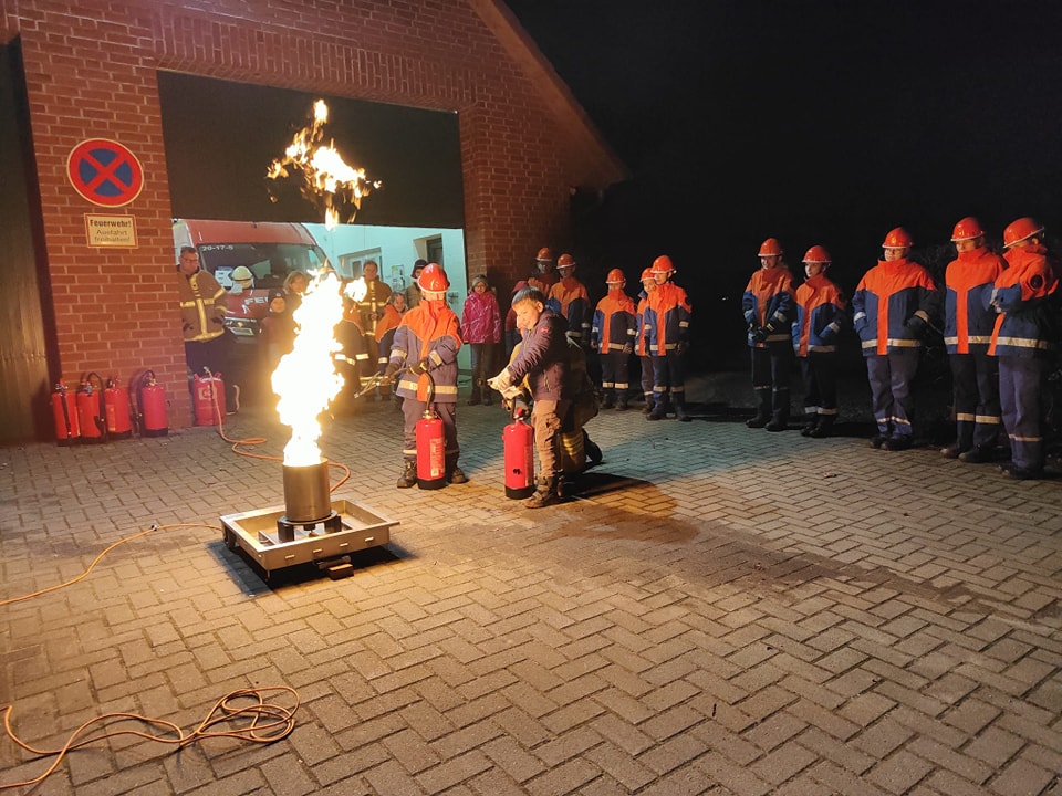 Der zweite Teil des Dienstes fand mit Unterstützung vom Ortsbrandmeister Andre Schwanke vor der Fahrzeughalle statt. Nach kurzer Erklärung der Funktionsweise eines Feuerlöschers, konnten alle Kinder an einer Simulationsanlage mit einem Wasserlöscher ein Übungsfeuer ablöschen.