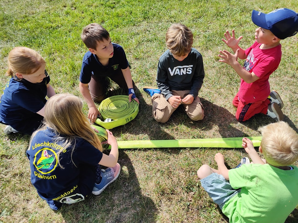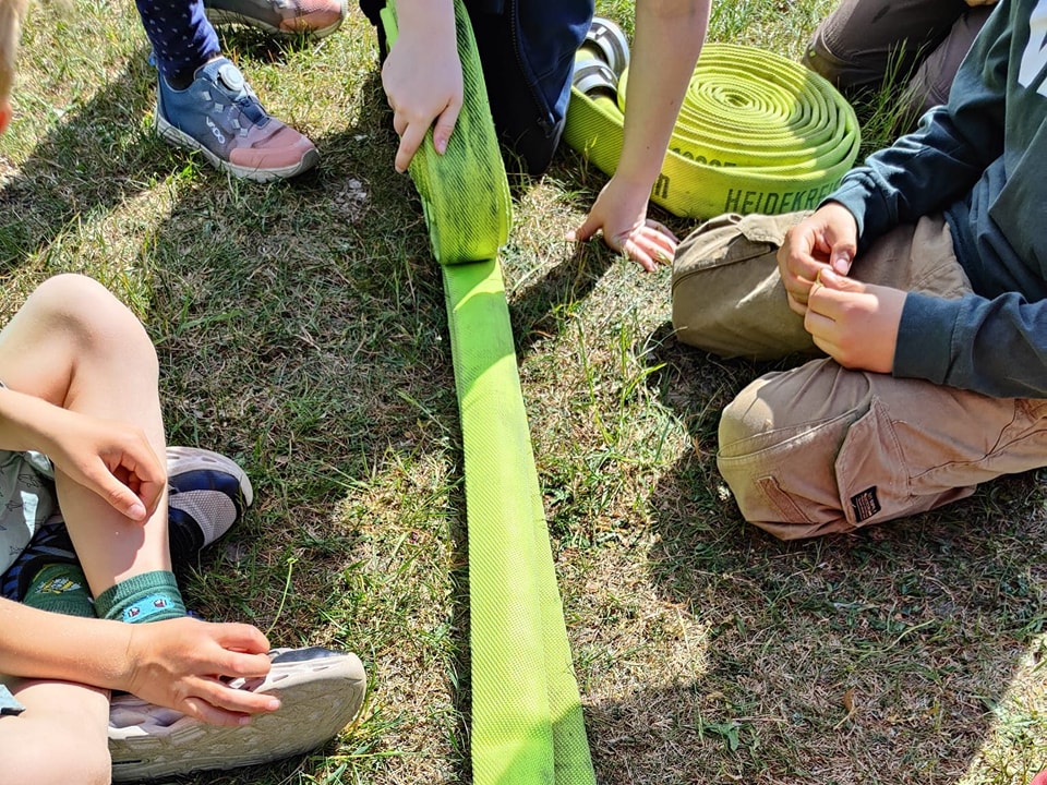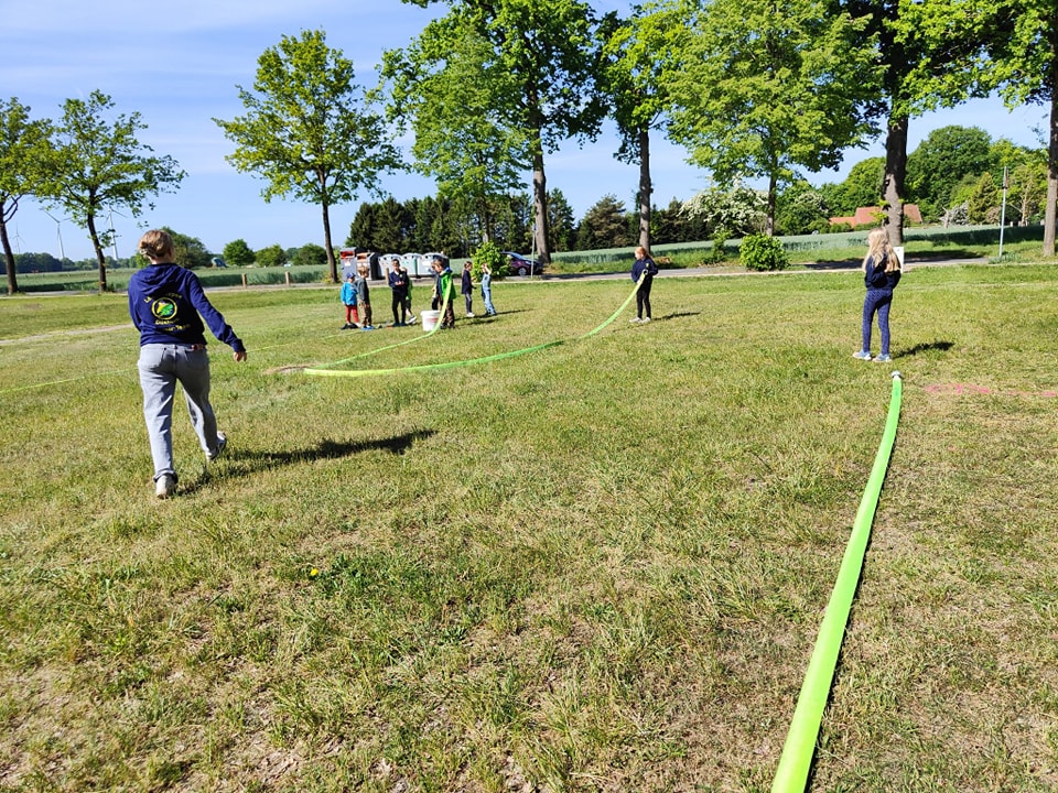 Die Abgrenzungen des 20 x 10 m großen Spielfelds wurden mit C-Schläuchen ausgelegt und nebenher noch eine kurze Schlauchkunde durchgeführt. Alle waren mit Eifer dabei, sodass das Spiel zügig durchgeführt werden konnte. Zwischendurch wurden die beiden Gruppen noch einmal durchgetauscht, bevor es zum gemeinsamen Abbau ging. Alle blicken voller Vorfreude auf das Turnier am Samstag.