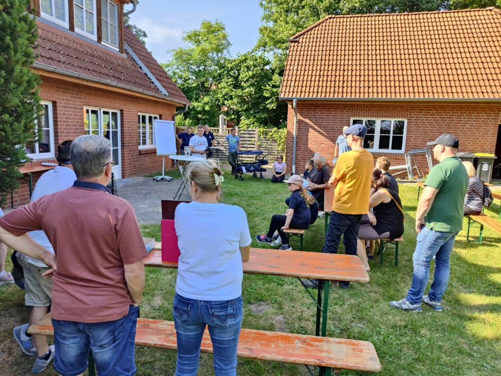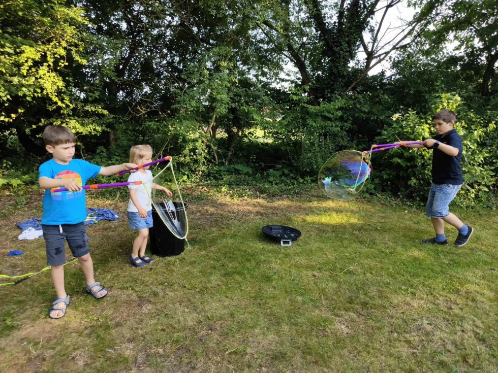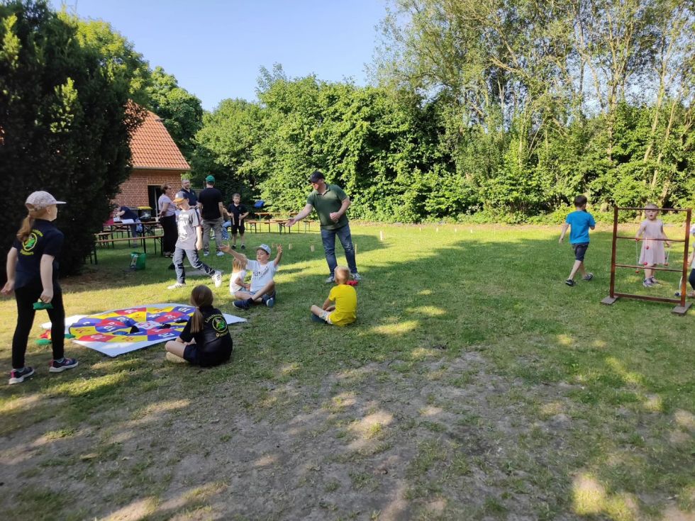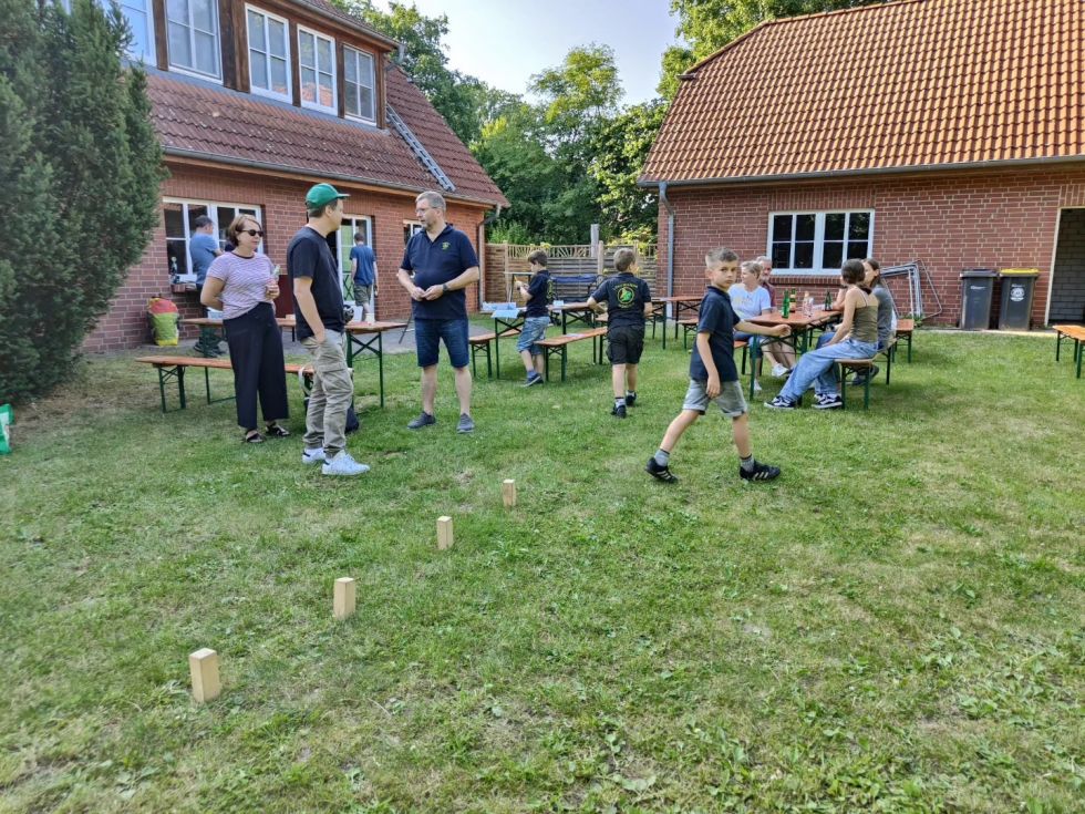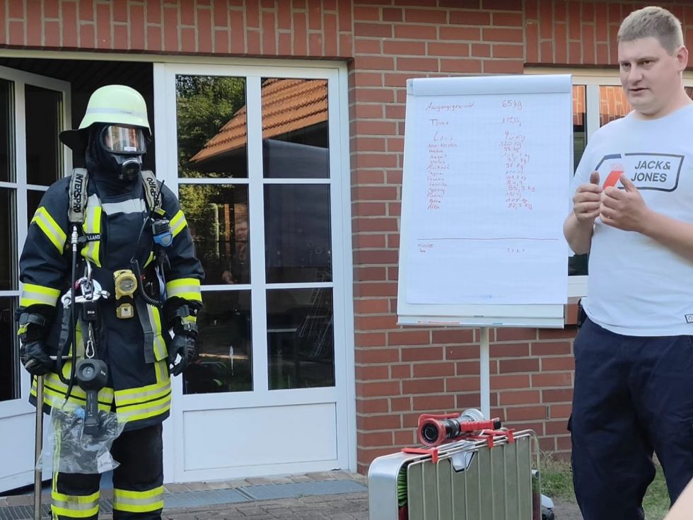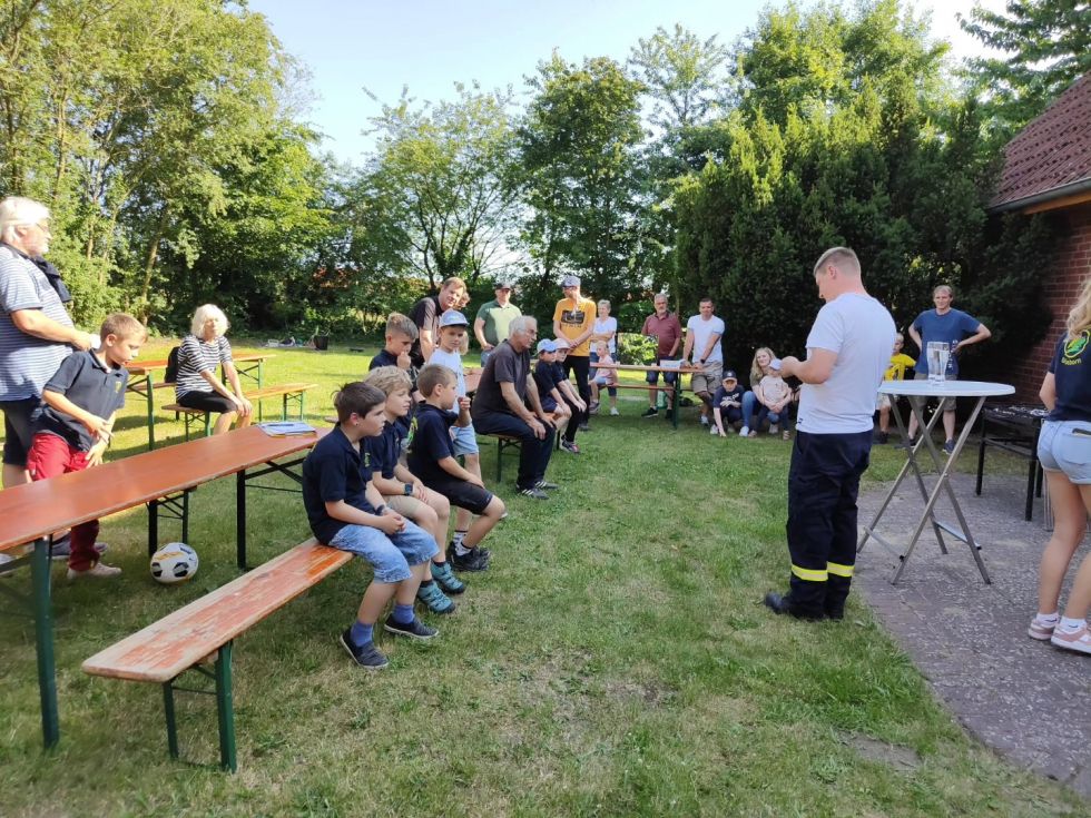 Dazu wurde die Fahrzeughalle vernebelt und die Kinder konnten sich zusammen mit ihren Eltern Hand in Hand hindurch tasten. Mirco Zurovskis erklärte zudem die komplette Schutzausrüstung eines Atemschutzgeräteträgers. Im Anschluss sollten die Eltern in einem Schätzspiel aufschreiben, wie viel zusätzliches Gewicht dabei zusammenkommt. Für die Kinder waren zahlreiche Spiele aufgebaut. Zur Stärkung gab es Leckeres vom Grill sowie die selbst gemachten Salate der Eltern. Nach vielen Gespräche, lustigen Spielen endete ein schöner Nachmittag und es wurden alle in die Sommerpause entlassen.