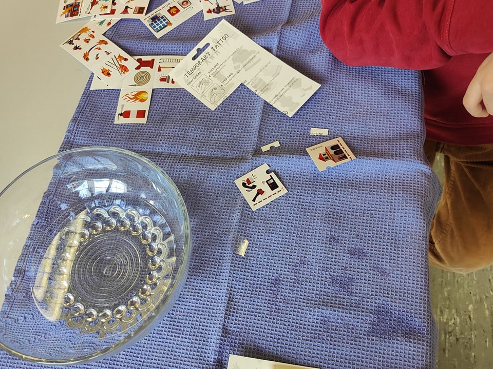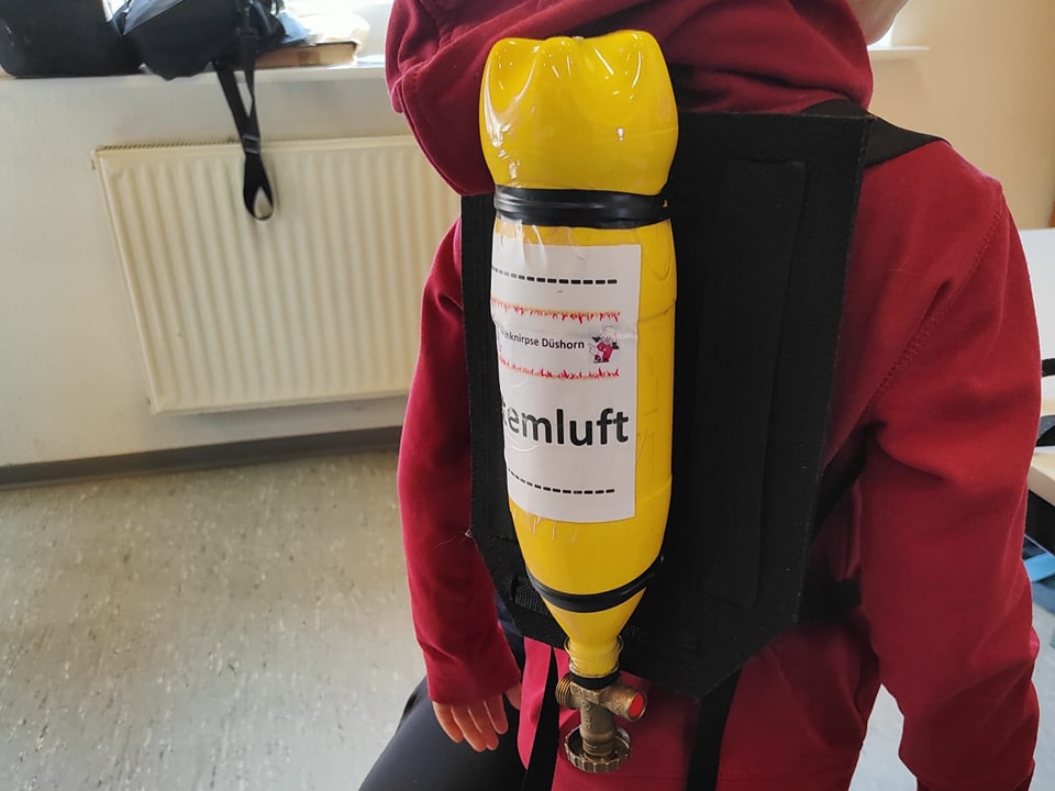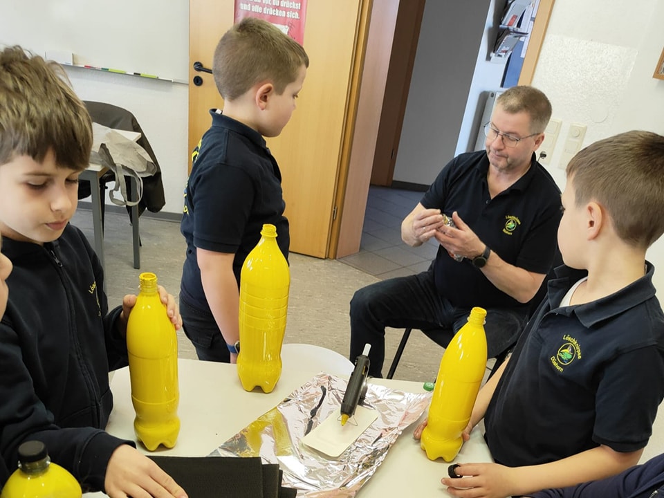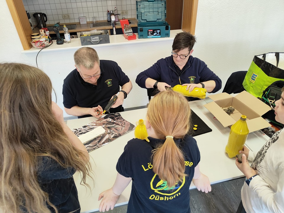 Stück für Stück entstand aus einer gelb eingefärbten PET-Flasche ein komplettes Gerät. Zwischendurch wurden Malpausen eingelegt und die Arme mit Feuerwehr-Tattoos verziert. Beim nächsten Mal sollen die Geräte dann eingeweiht werden.