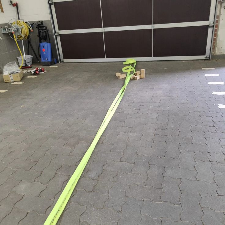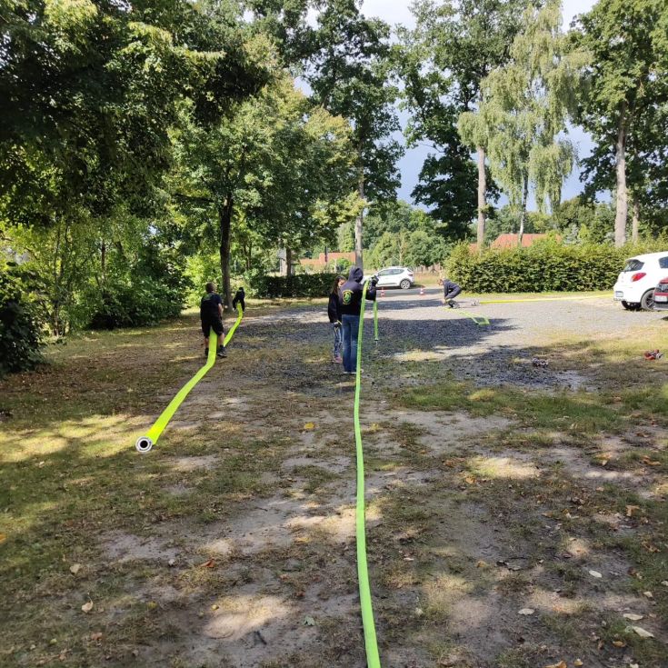 Nach dem Anziehen der Handschuhe folgte zunächst eine Runde Schlauchkegeln, bevor auf dem Parkplatz ein Löschangriff mit D-Schläuchen aufgebaut wurde und die Pflanzen ein wenig bewässert wurden. Das Aufrollen der Schläuche klappte danach in Teamarbeit sehr gut.