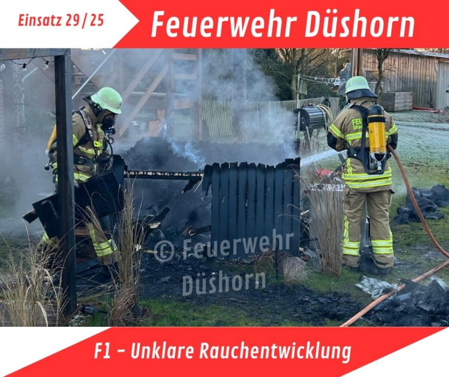 (mh) Am Dienstagmorgen wurde die Feuerwehr Düshorn zunächst zu einer unklaren Rauchentwicklung im Bereich „Fallingbosteler Straße/Ecke Rehrweg“ alarmiert. Bereits nach kurzer Lageerkundung konnte ein Feuer auf einem Hof an der Straße „Auf dem Kamp“ festgestellt werden. Dort war aus bisher ungeklärter Ursache ein mit Holz verkleideter Whirlpool in Brand geraten. Anwohner hatten bereits erste Löschmaßnahmen mit einem Feuerlöscher eingeleitet.