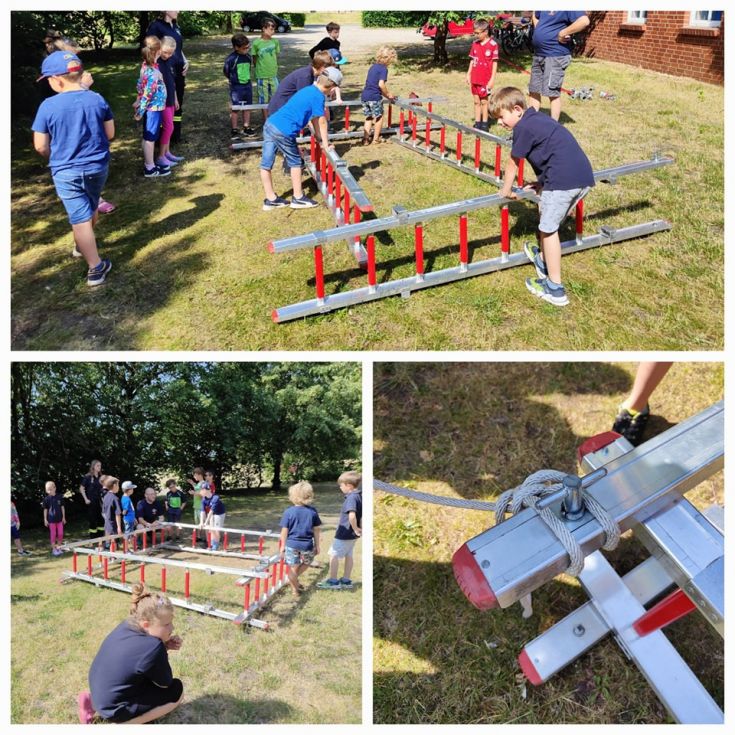 Die Löschknirpse lernten am letzten Samstag die vierteilige Steckleiter kennen. Nach kurzer Erklärung der Länge und Handhabung konnten auch die Kinder „mitanfassen". Was bei der Einsatzabteilung das provisorische Auffangbecken ist, wurde bei den Löschi‘s natürlich gleich zum Pool. Also packten alle mit an und zügig war die Plane drin.