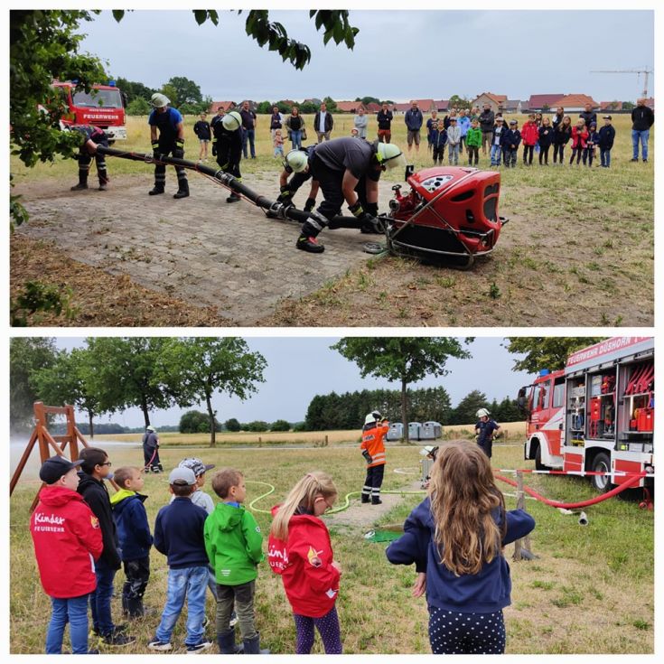 Sommerferienabschluss bei der Kinderfeuerwehr. Die Löschknirpse kamen zusammen mit ihren Eltern und Geschwistern zum letzten Dienst vor den Ferien. Das Betreuerteam und der Ortsbrandmeister mit stellv. begrüßten alle bei herrlichem Wetter. Die Wettbewerbsgruppe hatte ihre Übungseinheit für die Kreiswettbewerbe kurzerhand umgelegt und führte diese am Samstag vor. Die kleine Generalprobe wurde begeistert aufgenommen.