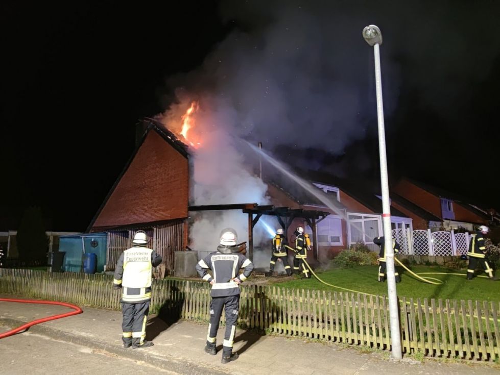 Feuer zerstört Reihenendhaus in Walsrode Aus noch ungeklärter Ursache kam es in den frühen Morgenstunden des 01.05.2022 gegen 02:15 Uhr zu einem Feuer in einem Reihenendhaus im Bereich Rembrandtwinkel/Dürerring in Walsrode. Als die Einsatzkräfte aus Walsrode, Honerdingen und Benzen wenig später an der Einsatzstelle eintrafen, schlugen Flammen sowohl aus dem Erdgeschoss sowie dem Obergeschoss des betroffenen Gebäudes. Eine Terrassenüberdachung stand ebenfalls in Vollbrand. Die Flammen hatten bereits den Dachstuhl des Gebäudes erfasst. Um die Brandausbreitung auf weitere Gebäudeteile des Reihenhauses zu verhindern, wurde umgehend ein massiver Löschangriff vorgenommen.
