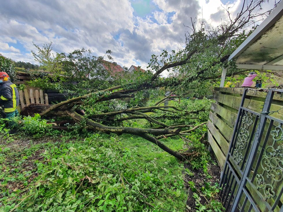 Durch Sturmtief Eugen drohte am 04.05.2021 ein Baum auf ein Wohnhaus zu fallen. Dieser wurde von der Feuerwehr sicher zum fallen gebracht. Ein ebendfalls umgstürzter Abzweig des Stammes, der auf einer Terrassenüberdachnung lag, wurde Mithilfe der Motorkettensäge beseitigt.