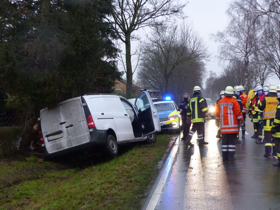Am Montag den 18.01.2021 kam es gegen 16:00 Uhr in der Walsroder Straße zu einem Verkehrsunfall. In dessen Folge kam ein Kleintransporter von der Fahrbahn ab und kam im Seitenraum zum Stehen. Neben der Polizei und dem Rettungsdienst wurden auch die Freiwilligen Feuerwehren Düshorn und Krelingen zu Hilfe gerufen. Die Meldung, dass jemand eingeklemmt sei, bestätigte sich zum Glück nicht. So musste die Feuerwehr nur Brandschutz- und Sicherungsmaßnahmen durchführen und die Aufräumarbeiten unterstützen.