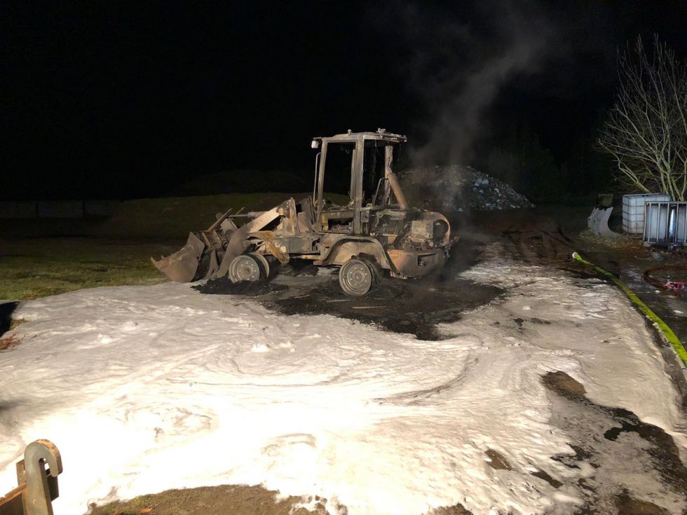 Mit dem Stichwort „F2, brennt Gebäude“ wurden in der Nacht zum Freitag den 26.02.2021 gegen 01:45 Uhr die Freiwilligen Feuerwehren Düshorn, Krelingen und Walsrode alarmiert. Mehrere Nachbarn hatten laute Knallgeräusche und Feuerschein wahrgenommen und daraufhin die Feuerwehr gerufen. Bei Ankunft der ersten Kräfte stellte sich heraus, dass auf einem Grundstück ein Radlader brannte.