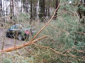 Pech hatte ein PKW-Fahrer der sich trotz Sturmtiefs nahe der Autobahn im Wald befand. Ein Baum schlug auf dem Heck seines Auto auf und zerstörte dabei sämtliche Heckscheiben. Dabei zog sich der Fahrer eine stark blutene Verletzung am Ohr zu, die durch Feuerwehrkräfte erstversorgt wurde. Anschließend wurde der Patient den Johanniter übergeben. Die Straße wurde geräumt und die Unfallstelle an die Polizei übergeben.