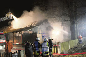 Trotz eines Großaufgebotes an Einsatzkräften und des massiven Angriffes mit Wasser zu Boden und aus der Luft ist am späten Sonntagabend eine Scheune an der Straße Auf dem Kamp in Düshorn ausgebrannt. Zahlreiche Pferde, die bei Entstehung des Brandes in der Scheune waren, wurden von Anwohnern rechtzeitig in Sicherheit gebracht. Zwei Anwohner erlitten dabei leichte Verletzungen. Die Freiwilligen Feuerwehren aus Düshorn, Walsrode, Honerdingen und Krelingen waren mit insgesamt 102 Ehrenamtlichen vor Ort. Auch die Drehleiter aus Walsrode kam zum Einsatz.