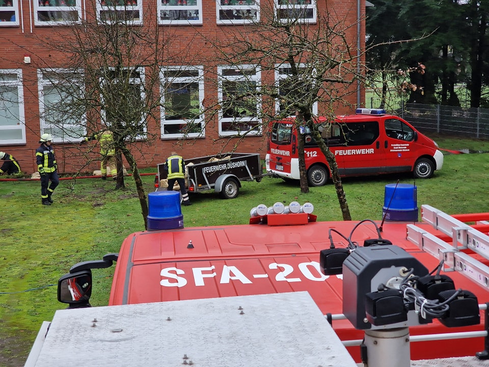 Der 2. Einsatz an Heiligabend führte die Feuerwehr Düshorn zur Grundschule. Dort drang Wasser in den Technikraum ein und drohte die Heizungsanlage und Elektroverteilung zu überfluten. Unter Einsatz einer Tauchpumpe und Tragkraftspritze wurden der Kellerschacht und Kellerraum ausgepumpt und zusätzlich mit Sandsäcken vor weiterem eindringen geschützt.