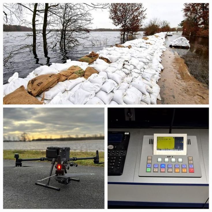 Einsatzkräfte der Feuerwehr Düshorn im Hochwassereinsatz. Einige Kameraden unterstützten als Mitglieder der ELO Walsrode ( Einsatzleitung Ort ) die ELO Ahlden zur Ablösung der seit Tagen im Einsatz befindlichen Einsatzkräfte. Zu dem im Einsatz auch die Drohnengruppe der Kreisfeuerwehr Heidekreis, in der auch Düshorner Feuerwehrkameraden vertreten sind.