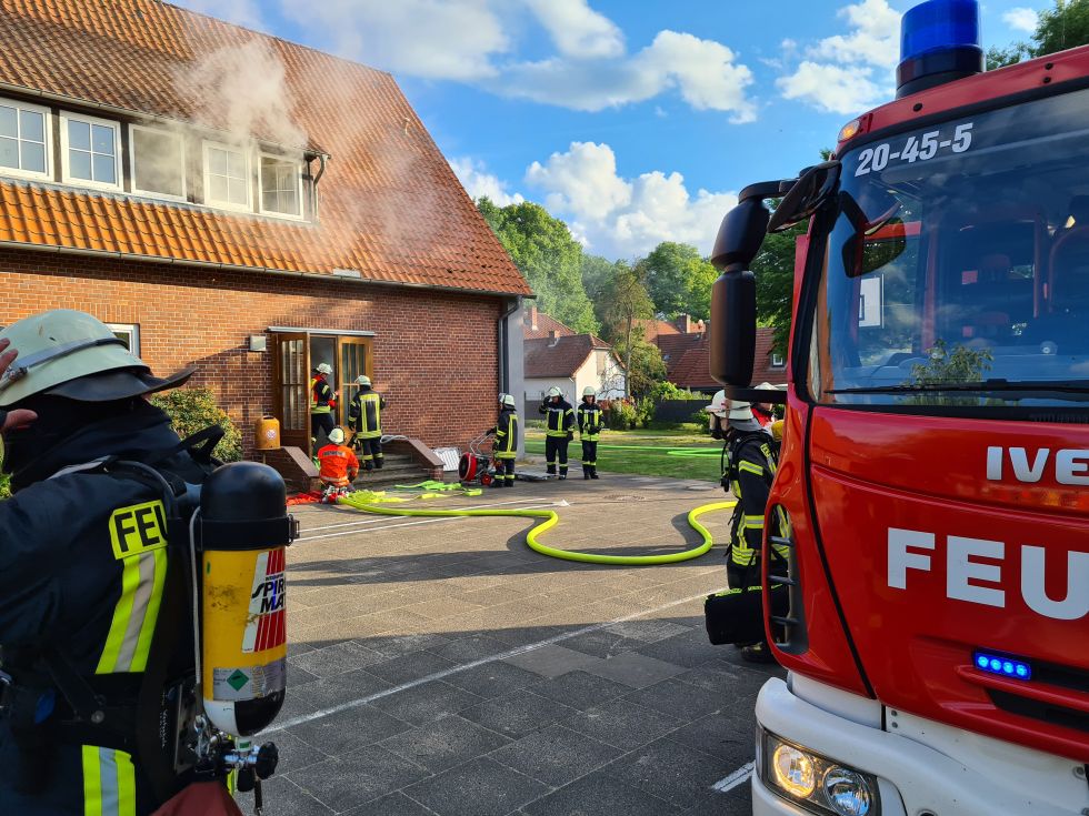 Unklare Rauchentwicklung “Auf dem Kamp 8” lautete die Meldung der Einsatzübung für den Dienstabend. Das LF Düshorn fuhr als erstes die Einsatzstelle an. Nach kurzer Lageerkundung und Rücksprache mit dem Brandschutzhelfer des Schadenobjektes der Grundschule Düshorn, konnte ein Feuer und starke Rauchentwicklung im Bereich der alten Aula im 1.OG festgestellt werden. Zudem wurde mehrere Personen vermisst, darunter auch Kinder.