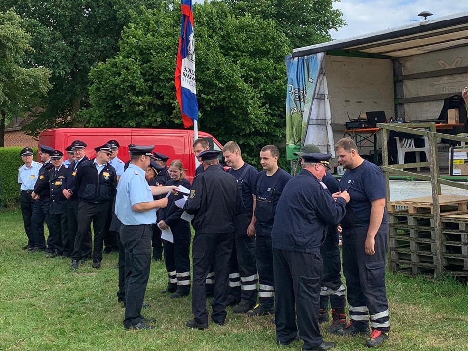 Erfolgreiche Kreiswettbewerbe für die Feuerwehr Düshorn. Wie schon in der Vorwoche fanden auch die Kreiswettbewerbe in Stellichte statt. 29 Gruppen gingen an den Start. Die Düshorner hatten ihre Fehler gut aufgearbeitet und schafften mit einer Gruppe eine fehlerfreie Übung und einen hervorragenden Platz 2. Zudem konnte erstmalig die Leistungsspange an Düshorner Kameraden verliehen werden.
