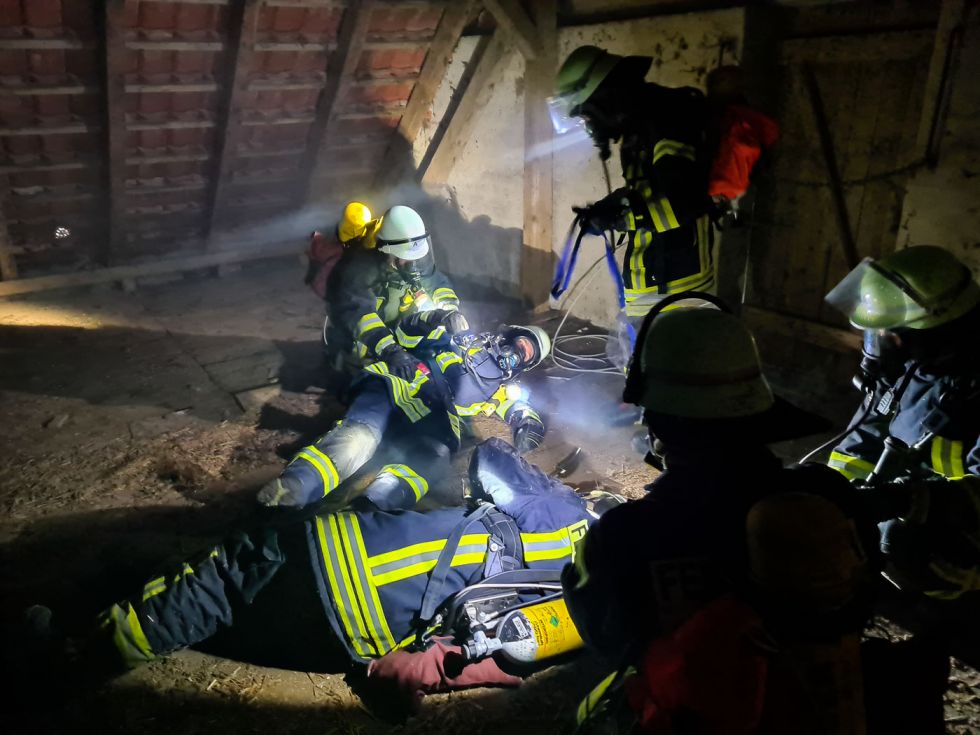Die Atemschutzgruppenführer aus Düshorn und Krelingen haben sich abgestimmt und ein riesiges Übungsobjekt für ein Atemschutztraining in Bockhorn gefunden. Danke an Dirk an dieser Stelle. Für die Übung wurden insgesamt acht Puppen in den Winkeln des zweigeschossigen landwirtschaftlichen Nebengebäudes verteilt.