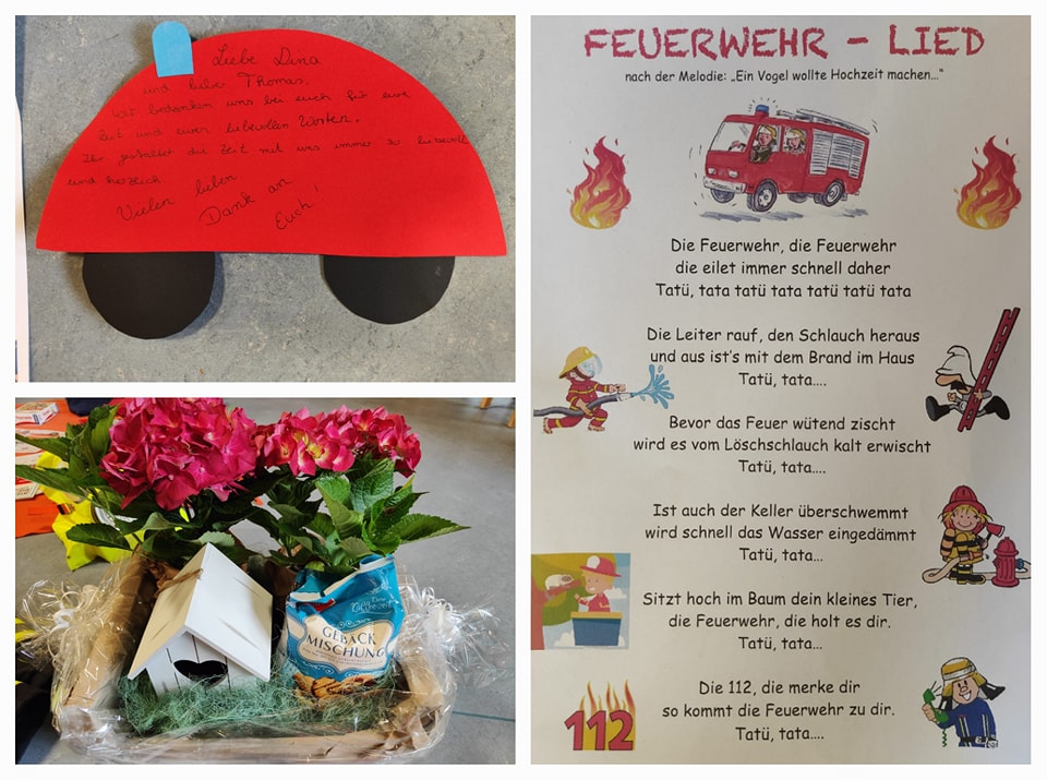 . Wie schnell ziehen sich die Einsatzkräfte um und was benötigen sie alles für den Einsatz war dabei nur ein Highlight. Zudem bekamen die Kinder gezeigt wie die Feuerwehr ausgerüstet mit Atemschutzmaske ausschaut und sich anhört sowie die Fluchthaube zur Rettung von Personen aus verqualmten Räumen. Auch wichtige Regeln wie der Notruf 112 wurden gelernt. Die Kita hatte noch ein Feuerwehrlied vorbereitet und überreichte ein kleines Dankeschön . Es ist immer wieder eine gute Zusammenarbeit mit den „Nachbarn“.
