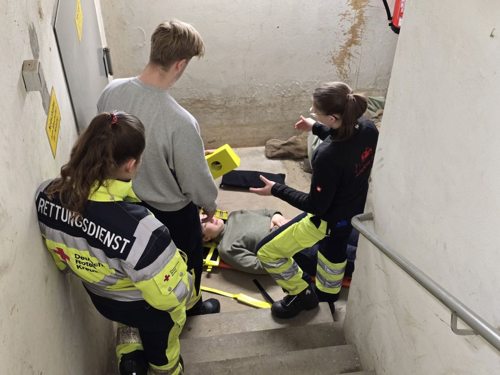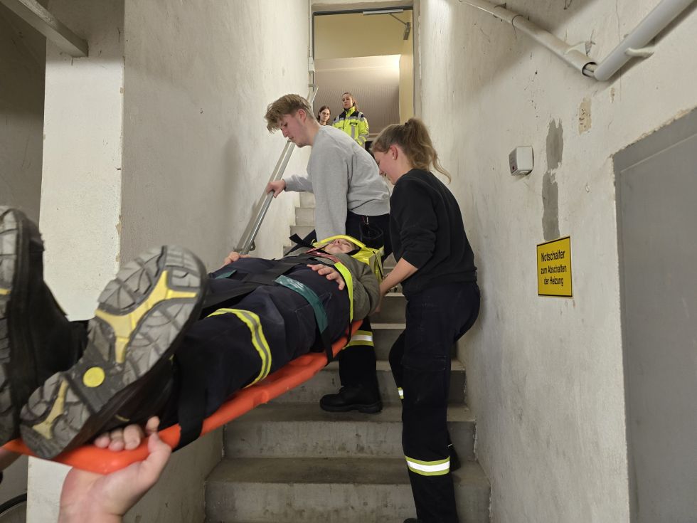 Neben dem Transport über Treppen – sowohl hinunter als auch hinauf – mit Tragestuhl, Rettungstuch, Spineboard und Schaufeltrage lag das Augenmerk auch auf dem richtigen Verlasten und Vorbereiten sowie dem Umlagern auf die Trage des Rettungswagens.