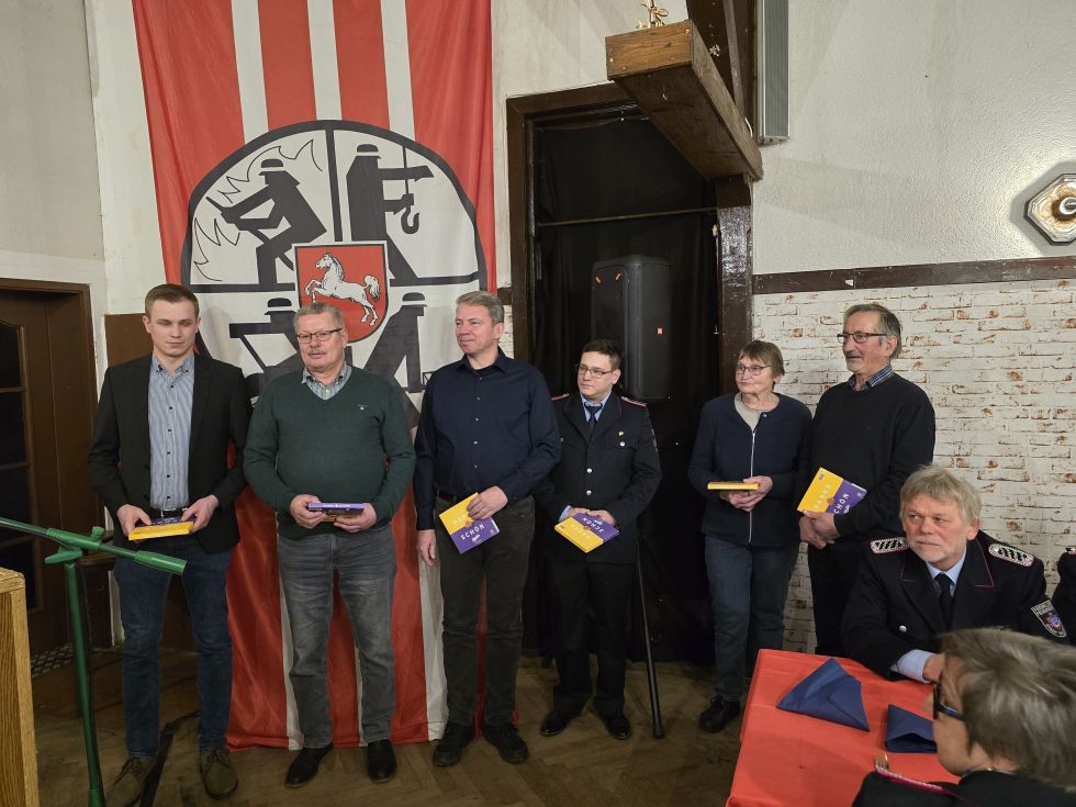Mit dem Ehrenzeichen des Heidekreises für den Einsatz beim Hochwasser zum Jahreswechsel 2023/2024 wurde Ingelore Küddelsmann ausgezeichnet, da sie beim offiziellen Festakt verhindert war. Für langjährige Mitgliedschaft wurden Mirco Zurovskis (25 Jahre), Marco Poppe (40 Jahre) sowie Hans-Heinrich Alm (50 Jahre) ausgezeichnet. Nach dem Besuch der erforderlichen Lehrgänge wurde Lilli Gerecke zur Feuerwehrfrau ernannt. Dominik Male, Niklas von der Weth und Leon Kulms wurden zum Oberfeuerwehrmann befördert. Marvin Schmidt und Henrik Dopmann tragen jetzt den Dienstgrad Löschmeister.