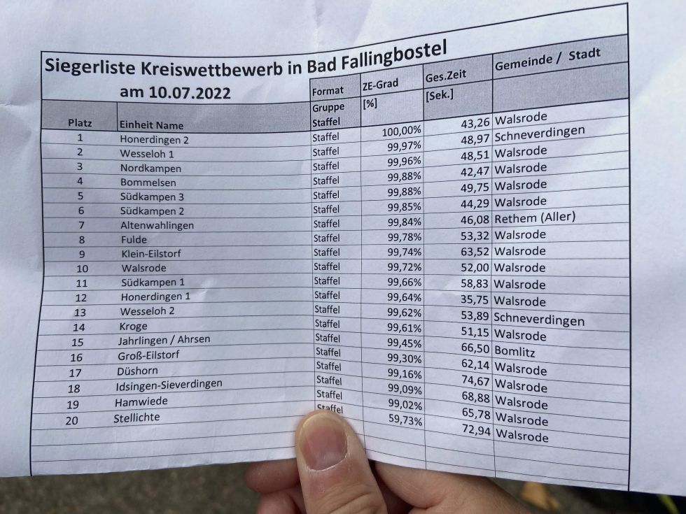 Im Rahmen des 112-jährigen Geburtstages des Kreisfeuerwehrverband Heidekreis haben kürzlich auch die Kreiswettbewerbe der Feuerwehr in Bad Fallingbostel stattgefunden. Dabei konnte die Staffel „Honerdingen 2“ (Stadt Walsrode) mit 100 % Zielerreichungsgrad (ZE-Grad), also 0 Fehlerpunkten in alle drei Aufgaben, den ersten Platz für sich beanspruchen.