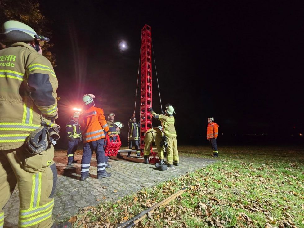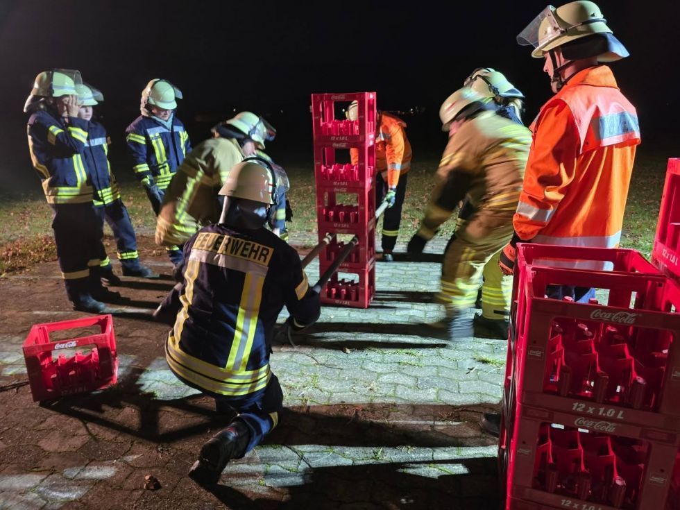 Auch beim Thema „Ausleuchten einer Einsatzstelle“ begann der Abend mit den Grundlagen im Unterrichtsraum. Anschließend folgte eine Aufgabe im Kistenstapeln. Es durfte alles benutzt werden, jedoch durften die bereits gestapelten Kisten nur mit Feuerwehrgerätschaften angehoben werden.