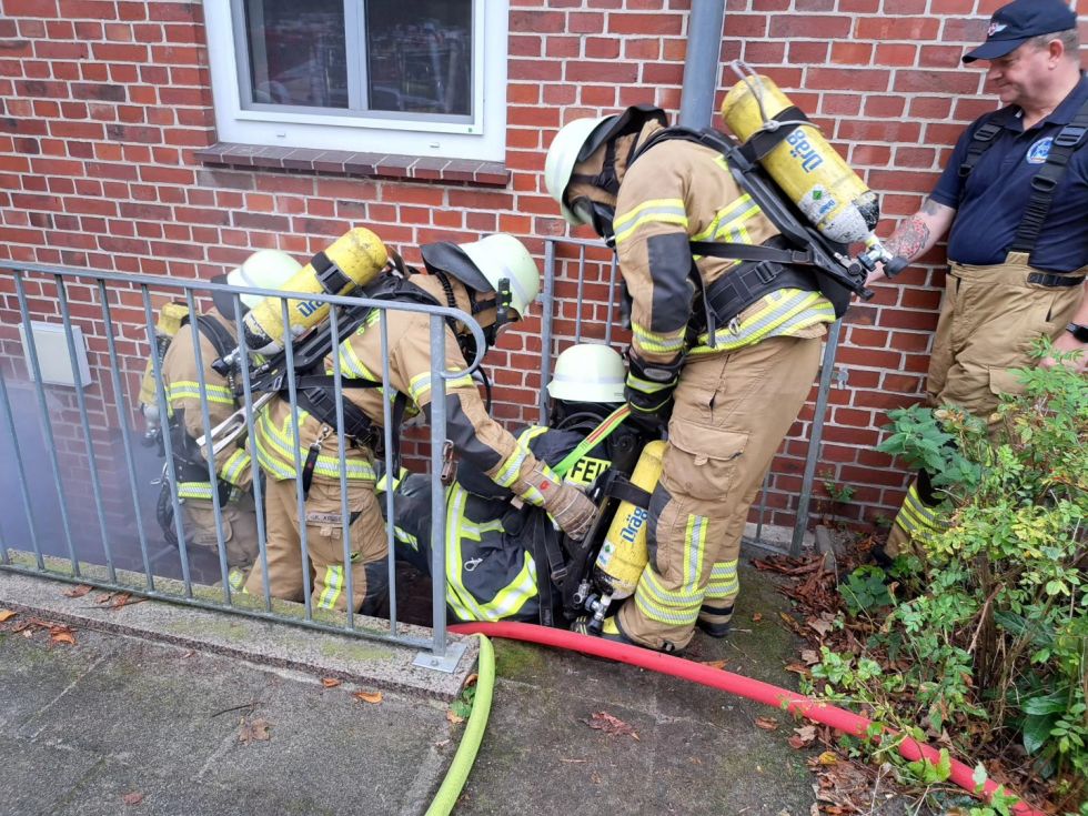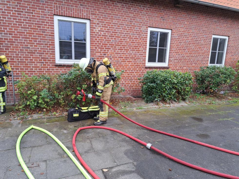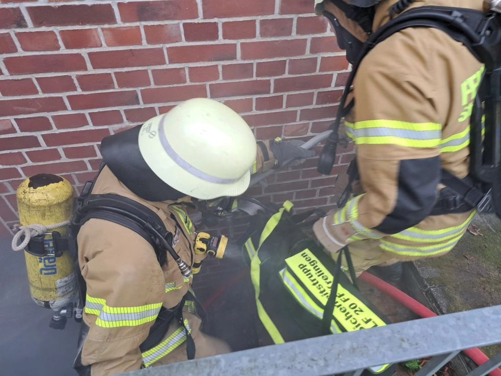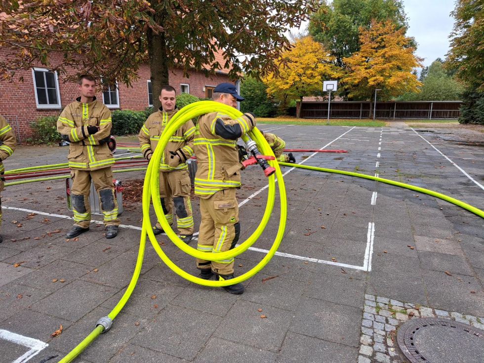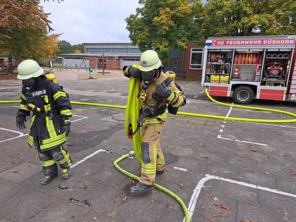 (mh) Der eigentliche Dienst in der Brandsimulationsanlage in Schneeheide musste aufgrund eines technischen Defekts in die Räumlichkeiten der Grundschule Düshorn verlegt werden. Der Hausmeister und Feuerwehrkamerad Thomas Reichstein unterstützte dabei. In den von Mirco Zurovskis und Carsten Küddelsmann vorbereiteten Einsatzübungen lag der Fokus auf dem Vorgehen in Kellerräumen und der dortigen Menschenrettung.