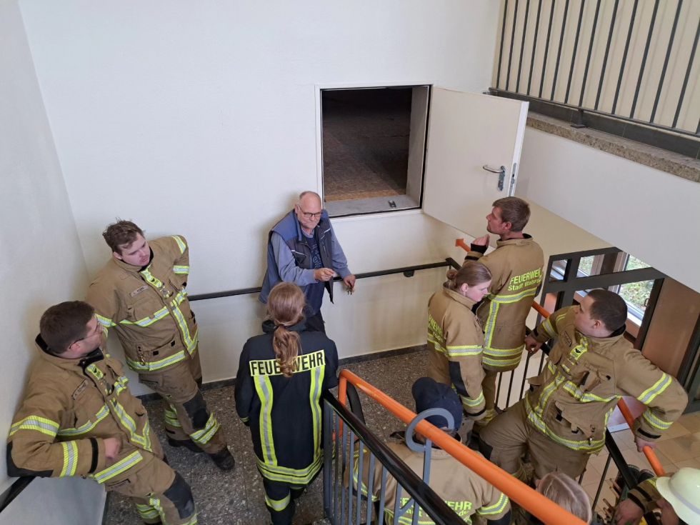 Erschwerend kam hinzu, dass austretendes Gas aus einer Gasleitung sowie ein Atemschutznotfall simuliert wurden. Dafür wurde sich von der FF-Krelingen die Sicherheitstrupptasche geliehen. Auch auf das richtige Belüften von Kellerräumen und das Schlauchmanagement wurde ein Augenmerk gelegt. Nach Abschluss der Übungen wurde die Gelegenheit für eine Objektbegehung durch Keller und Zwischenböden genutzt.