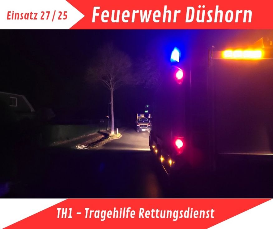 (mh) In der Nacht zum Dienstag wurde die Feuerwehr Düshorn zu Unterstützung des Rettungsdienst alarmiert. Nach Abschluss der Erstversorgung wurde die Patientin gemeinsam aus dem 1.OG die Treppe hinunter getragen.
