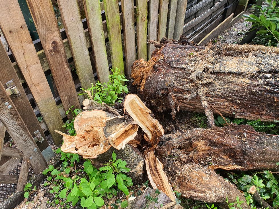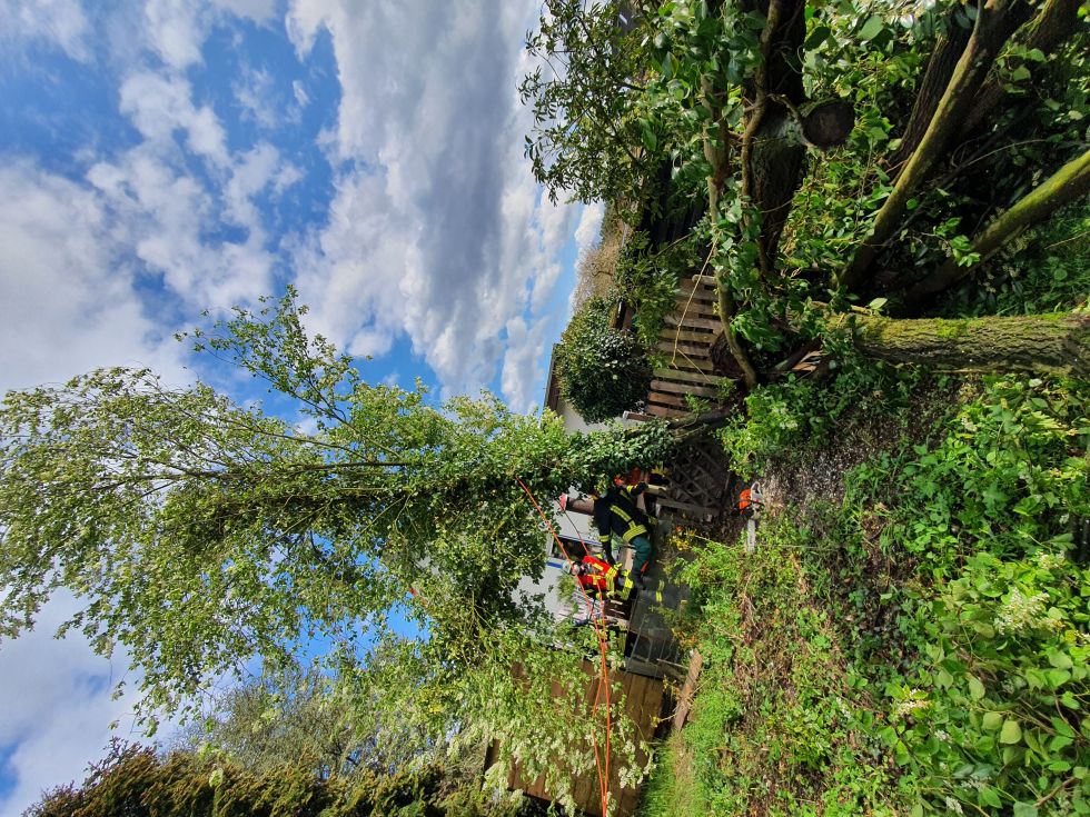 Durch Sturmtief Eugen drohte am 04.05.2021 ein Baum auf ein Wohnhaus zu fallen. Dieser wurde von der Feuerwehr sicher zum fallen gebracht. Ein ebendfalls umgstürzter Abzweig des Stammes, der auf einer Terrassenüberdachnung lag, wurde Mithilfe der Motorkettensäge beseitigt.
