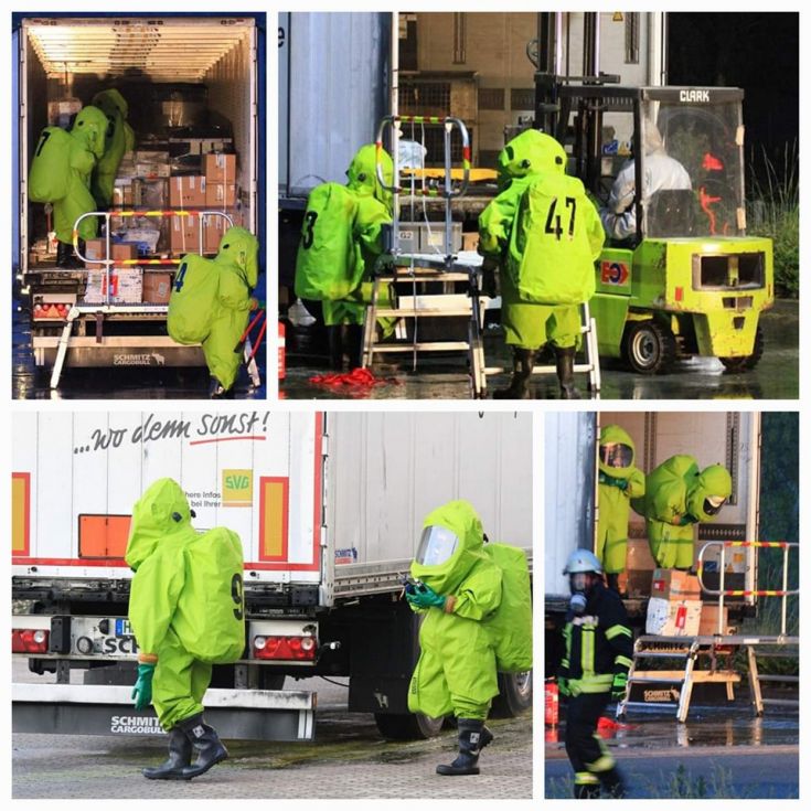 Daher mussten alle anderen Güter zunächst unter Schutzkleidung per Hand und mit einem Hubwagen entladen werden, bevor man den beschädigten Behälter erreichen konnte.