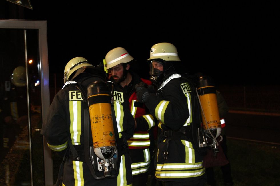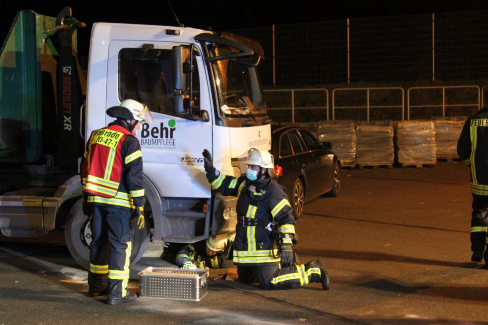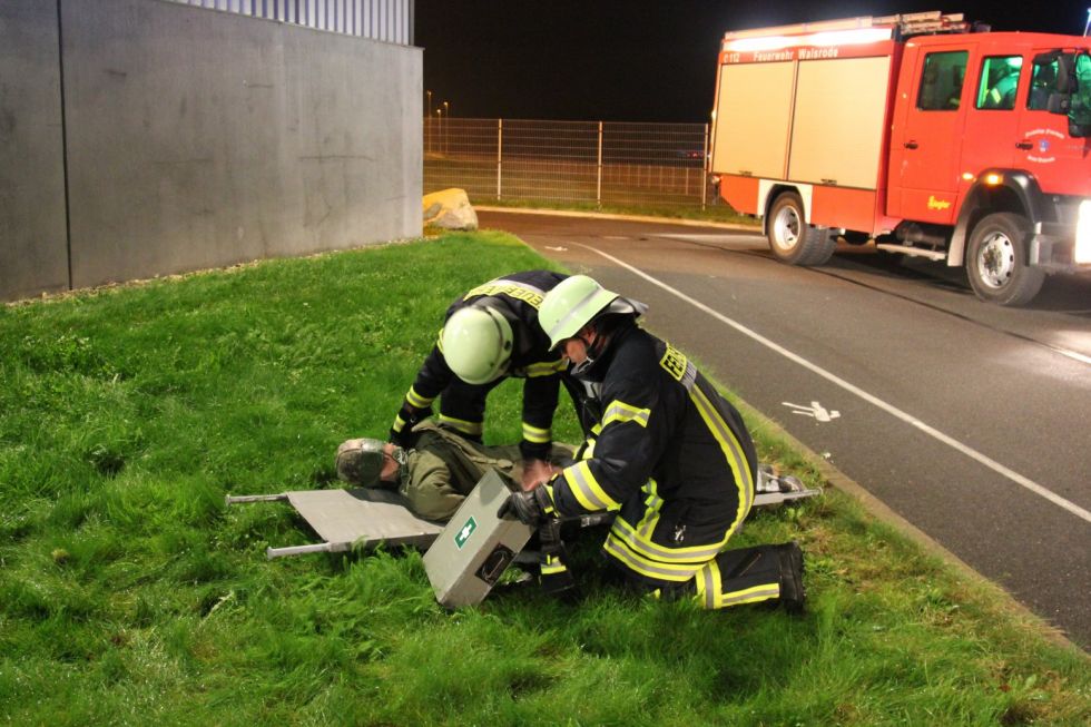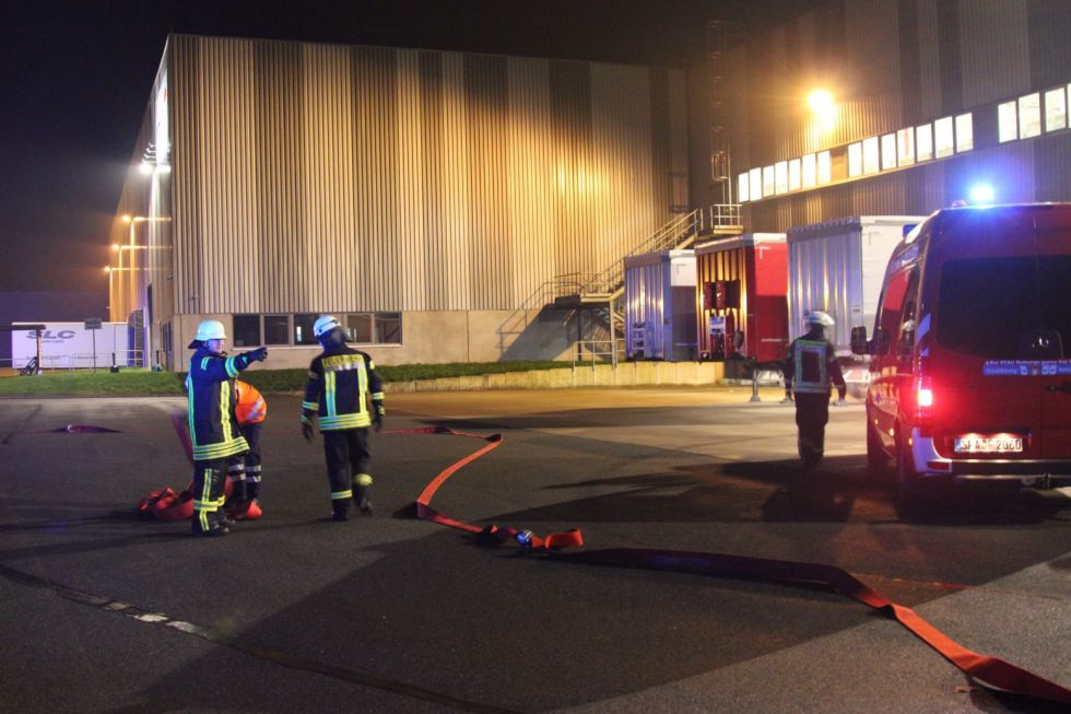 Unter Atemschutz drangen mehrere Trupps in die Halle ein, um die verletzten Personen zu retten. Mit Hilfe der Drehleiter wurde das Dach des Gebäudes kontrolliert. Eine Wasserversorgung wurde aus den Hydranten auf dem Firmengelände sichergestellt. Ein weiteres Übungsszenario sah vor, dass eine Person von einem LKW überrollt wurde. Auch hier konnten die Einsatzkräfte schnell mit technischem Gerät den eingeklemmten Übungsdummy befreien.