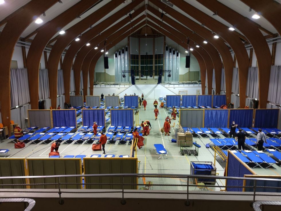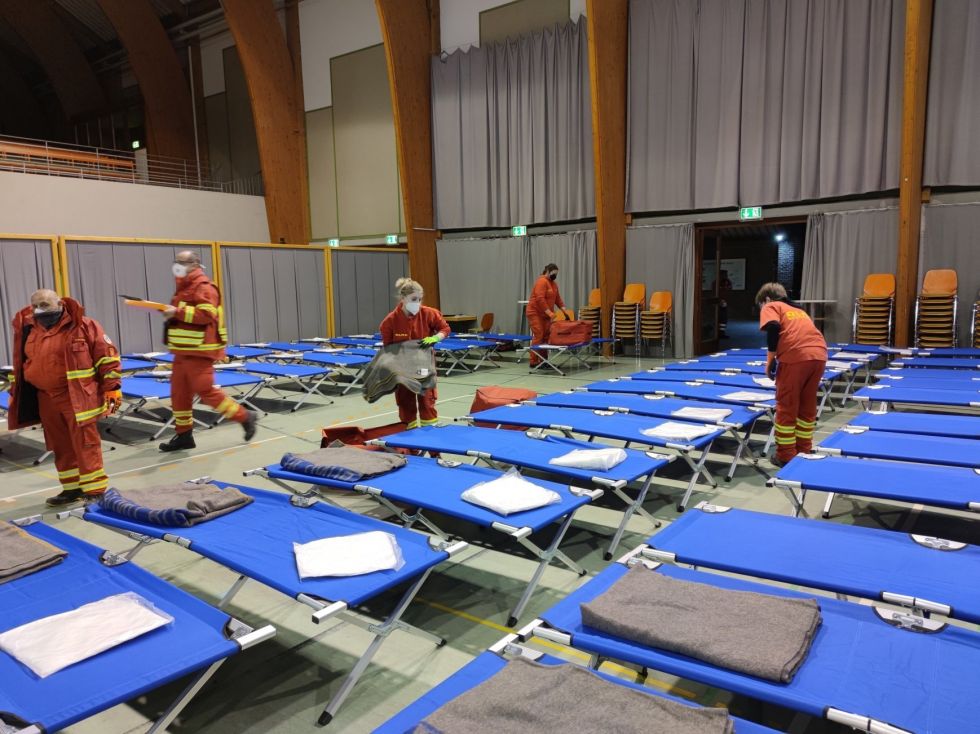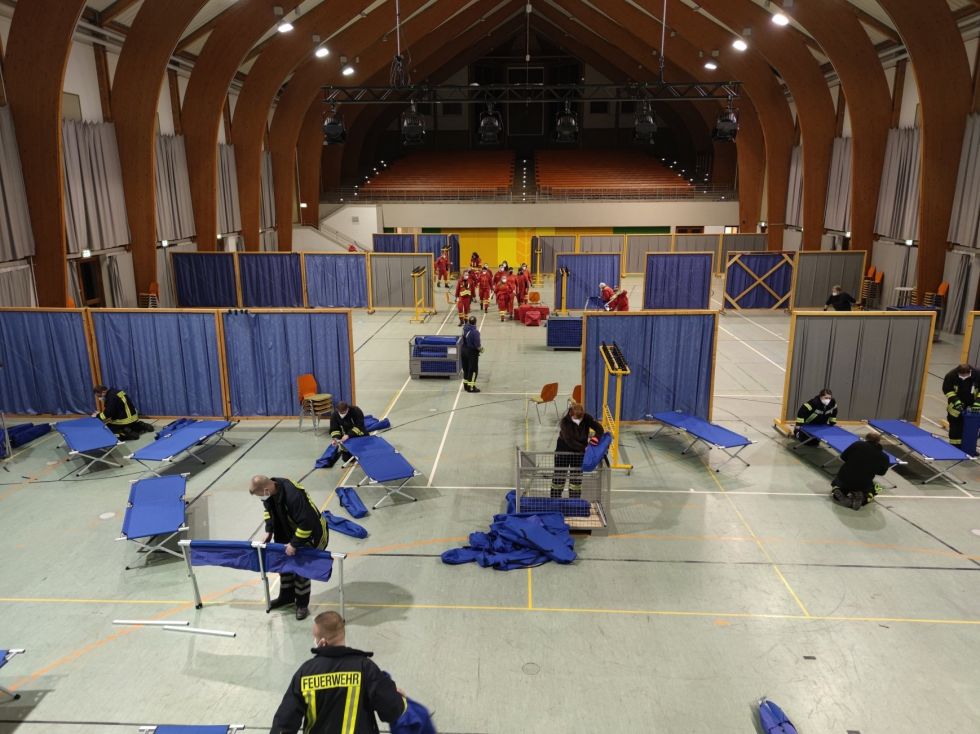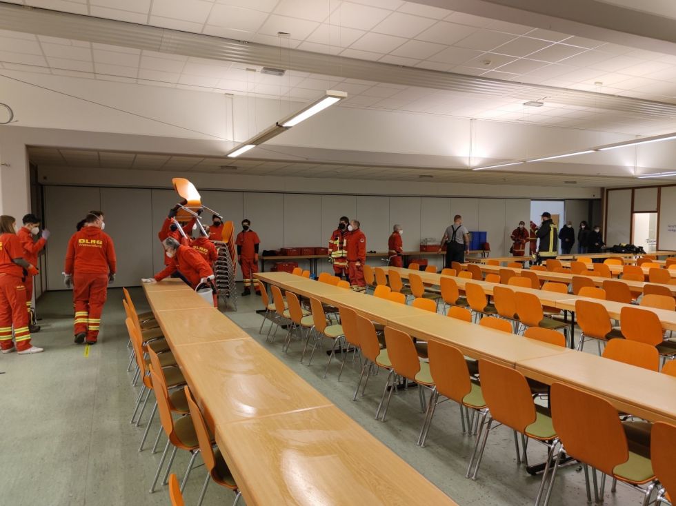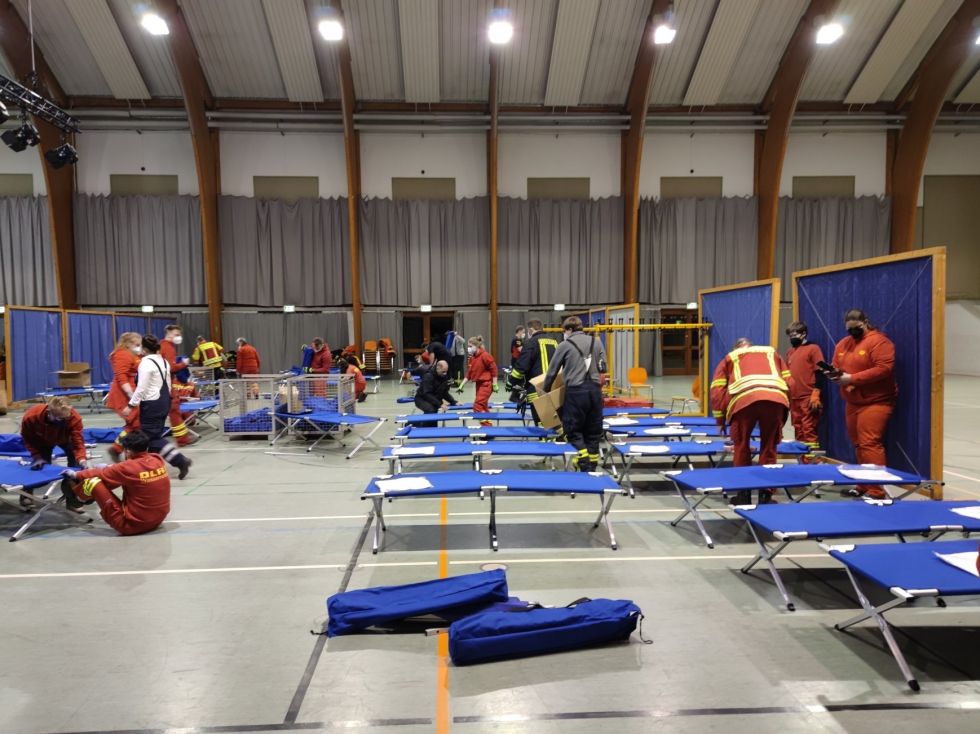 Parallel dazu wurde durch Einheiten von beiden DRK Kreisverbänden, dem Arbeiter-Samariter-Bund, der Johanniter Unfallhilfe und dem Technischen Hilfswerk Material für die Verpflegung der Personen eingekauft, das Außengelände hergerichtet und der Betrieb der Unterkunft für die kommenden Tage geplant und strukturiert. Alle Organisationen zogen gemeinsam an einem Strang, so dass die Arbeit schnell erledigt war und die Unterkunft wie gefordert, am Sonntagmorgen in Betrieb gehen konnte.