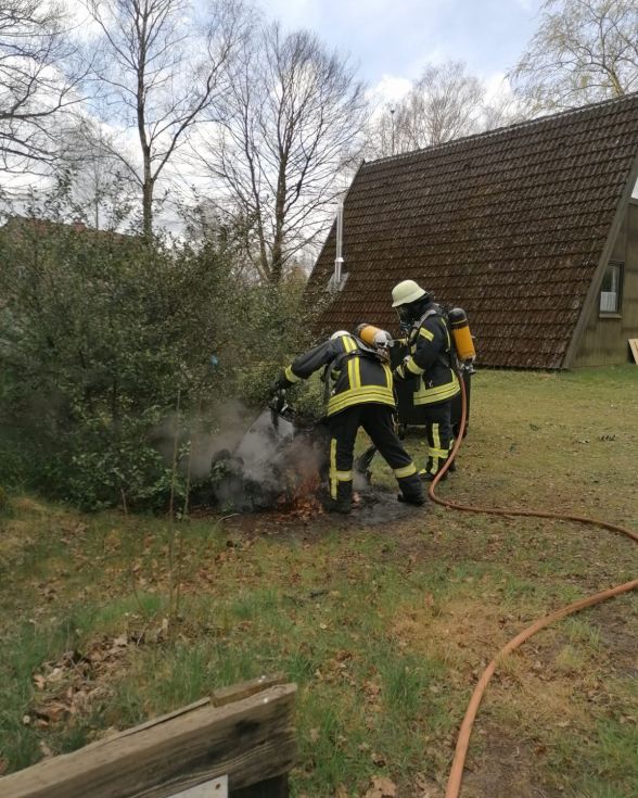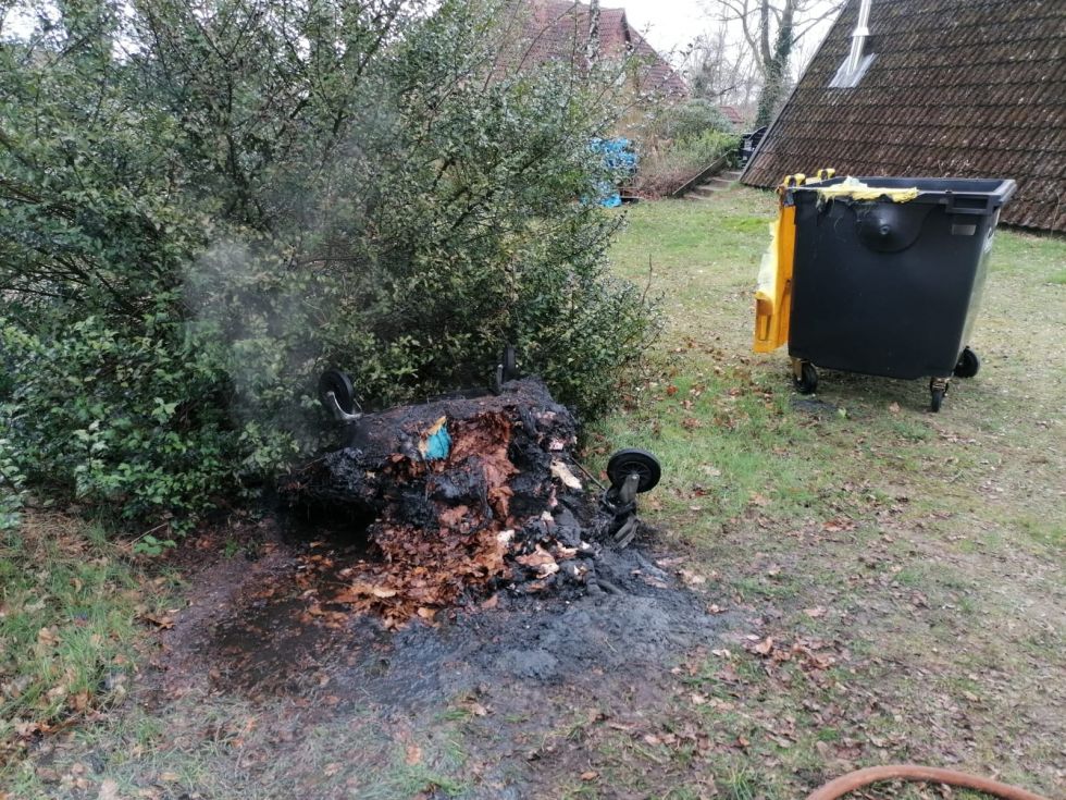 Um kurz vor 12 Uhr wurde die Feuerwehr Düshorn vom Mittagstisch weggerufen. Ein brennender Müllcontainer in der Straße "Am Berge" war der Grund für die Unterbrechung der Sonntagsruhe. Ein Trupp unter PA löschte die Reste des Restmüllcontainers ab. Die in der Nähe stehenden Container für Altpapier und Gelbe Tonne wurden nur leicht angeschmort
