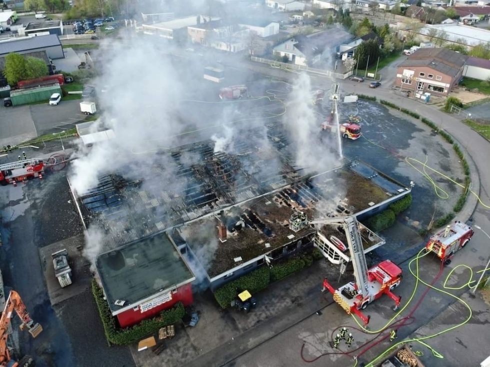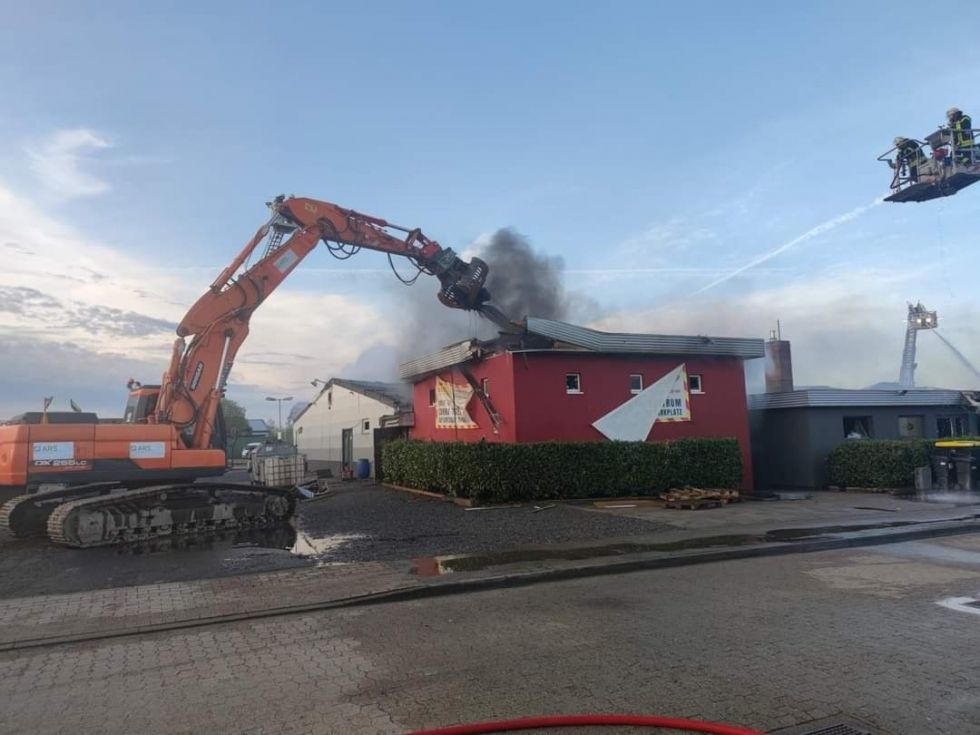 Um dem großen Bedarf an Atemschutzgeräteträgern gerecht zu werden, wurde zusätzlich der Fachzug Atemschutz/Strahlenschutz der Kreisfeuerwehrbereitschaft Umwelt angefordert. Die Löschmaßnahmen gestalteten sich schwierig, da das Objekt bereits sehr früh als einsturzgefährdet eingestuft werden musste. Daher war ein Löschangriff nur von außen und über die Hubrettungsfahrzeuge möglich.