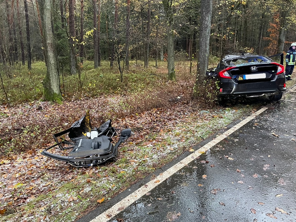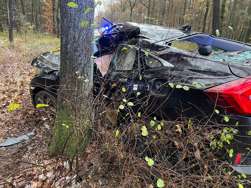 PKW kommt von regennasser Fahrbahn ab , Fahrerin eingeklemmt