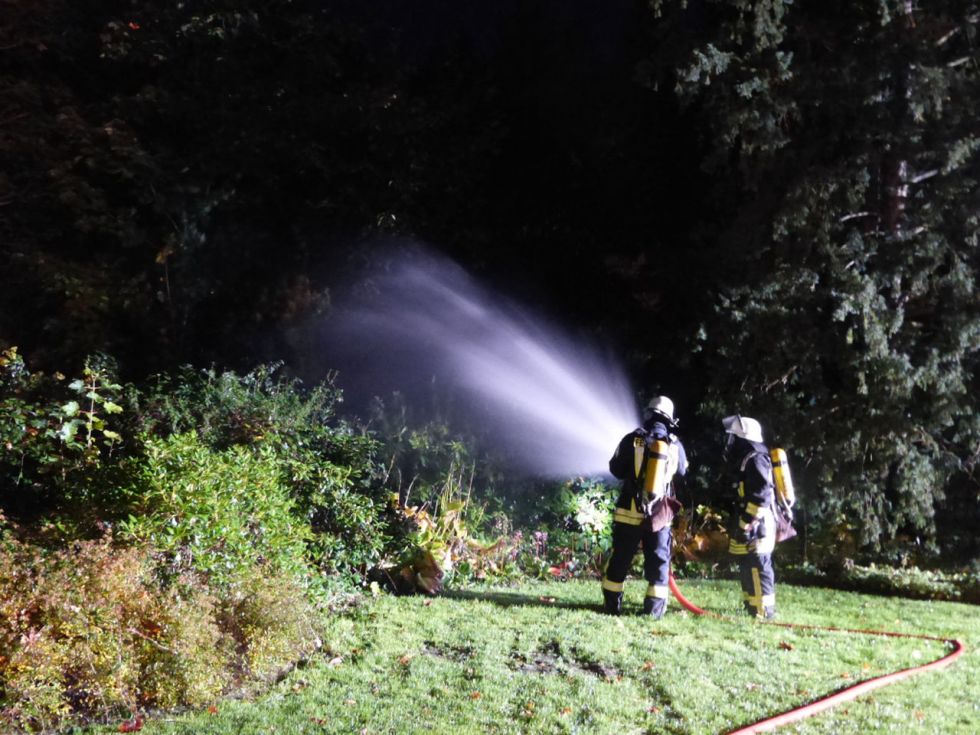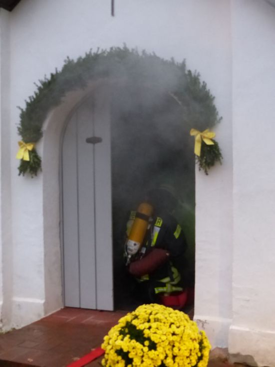 Parallel dazu wurde die Wasserversorgung vom Hydraten aufgebaut und die Brandbekämpfung eingeleitet. Nach dem Eintreffen der Drehleiter wurde diese im rückwärtigen Bereich mit dem Wenderohr zum Aufbau einer Riegelstellung zum Kirchenschiff in Stellung gebracht.