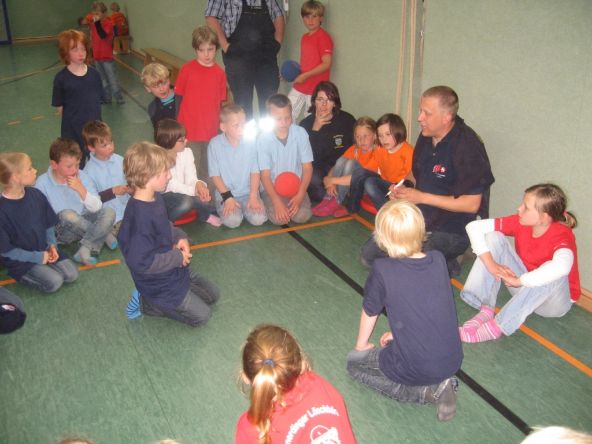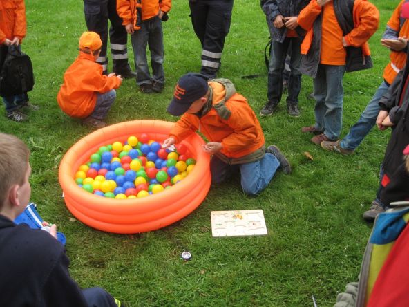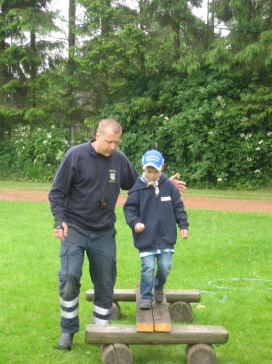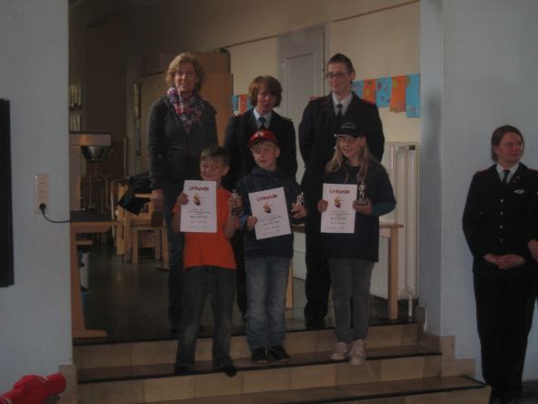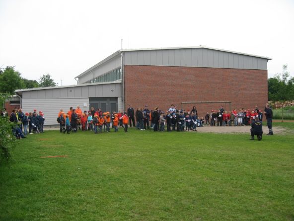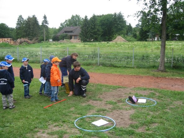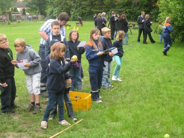 Die Aufgaben wurden von jedem Kind einzeln absolviert. Mit einem Ei mußte ein Hindernisparcour, der aus Übungsgeräten der Jugendfeuerwehr bestand, absolviert werden. Außerdem standen noch Gummistiefelweitwurf, Dosenwerfen und Puzzelteilesuche im Bällebad auf dem Programm. Was eigentlich zur Erfrischung dienen sollte, mußte an diesem Tag leider mit Regencap gespielt werden. Ein auf einem Helm befestigter Behälter gefüllt mit Wasser, mußte hüpfend transportiert werden, ohne viel zu verschütten. Zur Stärkung gab es Hot-Dog und eine große Auswahl an Kuchen. Unterstützt wurde das Team um Kerstin Schwanke, Brigitte Treptow und Steffen Lohrengel von Kameraden und Jugendfeuerwehrmitglieder der Feuerwehr Düshorn an den Stationen und der Verpflegungsstand wurde von Eltern übernommen. Zahlreiche Gäste besuchten die Veranstaltung und richteten bei der abschließenden Siegerehrung ihre Grußworte an die Kinder. Richtig stolz waren die drei Erstplazierten die einen Pokal in den Händen halten konnten. Aber auch alle anderen erhielten als Erinnerung an den Tag eine eigene Urkunde.