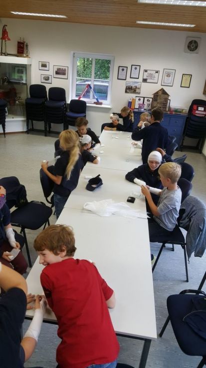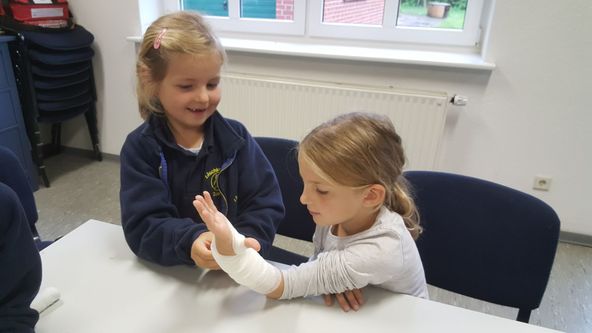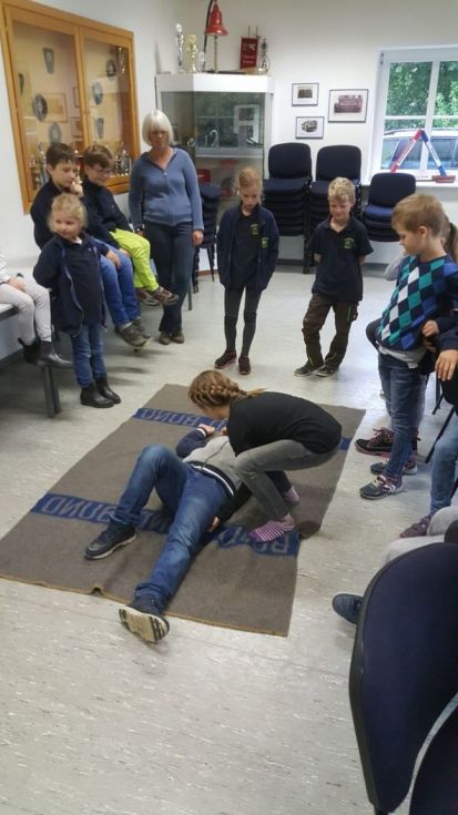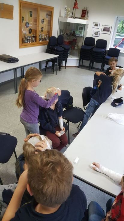 Im September haben die Löschknirpse in stark verjüngter Besetzung ihren Dienst nach den Sommerferien wieder aufgenommen. Erste Hilfe stand auf dem Plan und die Löschis waren mit voller Elan dabei. Notruf absetzen, Verbände anlegen und Stabile Seitenlage wurden vertieft und die daraus entstandenen Kunstwerke wurde natürlich stolz den Eltern präsentiert.