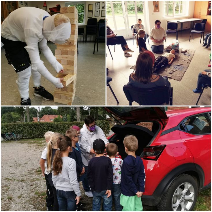 Die Löschis starteten ihren Dienst mit einigen Runden "Obstsalat und Co" um die Müdigkeit zu vertreiben und befassten sich dann mit dem Themen Erste Hilfe, stabile Seitenlage, Anlage von Verbänden und der Frage wo gibt es eigentlich einen Verbandkasten. Nachdem einige zu Mumien verwandelt waren, gab es noch eine Runde Riesenjenga und die Eltern bekamen ihre eingewickelten Kids überreicht.