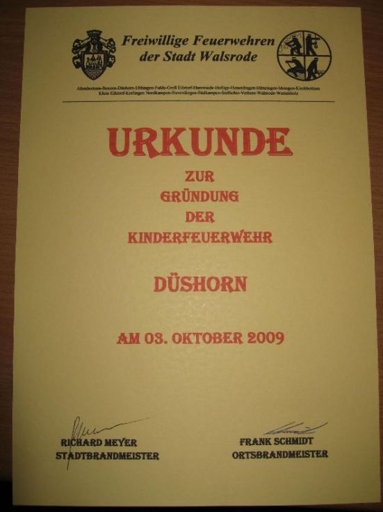 „Erst einmal müssen die Kinder wissen, dass Feuer kein Spielzeug ist“, unterstreicht Schwanke. „Durch das spielerische umgehen in der Gruppe mit dem Thema Feuerwehr werden zusätzlich auch Teamfähigkeit und Gemeinschaftssinn, die Grundgedanken der Feuerwehr, gestärkt“.Bei den Löschknirpsen haben sich bereits 30 Nachwuchsretter angemeldet. „Das ist ein tolles Ergebnis“, so Kerstin Schwanke. „Bei so einem starken Interesse müssen wir jetzt sogar zwei Gruppen bilden“. Schwanke wird sich zusammen mit ihrer Stellvertreterin Sabrina Zurovskis, der „Bastelfee“ Brigitte Treptow und dem Pädagogen Torsten Freitag um die Kinder kümmern. Das erste Treffen findet am Samstag, 10. Oktober, ab 10:30 Uhr im Feuerwehrhaus in Düshorn und danach immer alle zwei Wochen statt.Im Landkreis Soltau-Fallingbostel ist die Düshorner jetzt die fünfte Wehr nach Hope, Häuslingen, Hademstorf und Breloh, die eine Kinderabteilung gegründet hat. „Es ist einfach wichtig, die Kinder früh an die Feuerwehr heran zu führen“, erklärte dazu Stadtbrandmeister Richard Meyer. „Wir müssen die Entwicklung weiter fördern, damit sie später in unsere Fußstapfen treten“.
