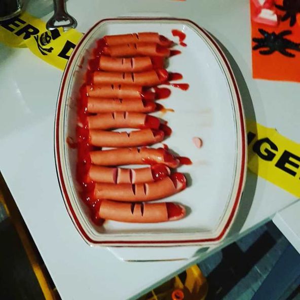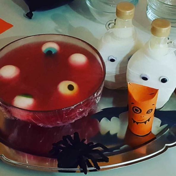 ihre Eltern mit, die freundlicherweise das Büffet mit vielen gruseligen, teils