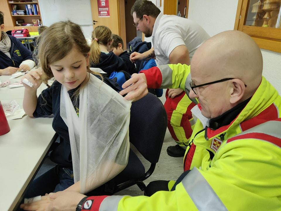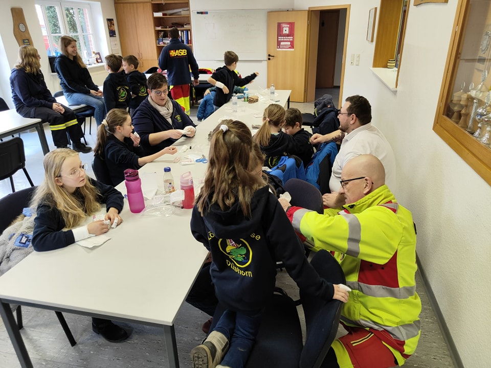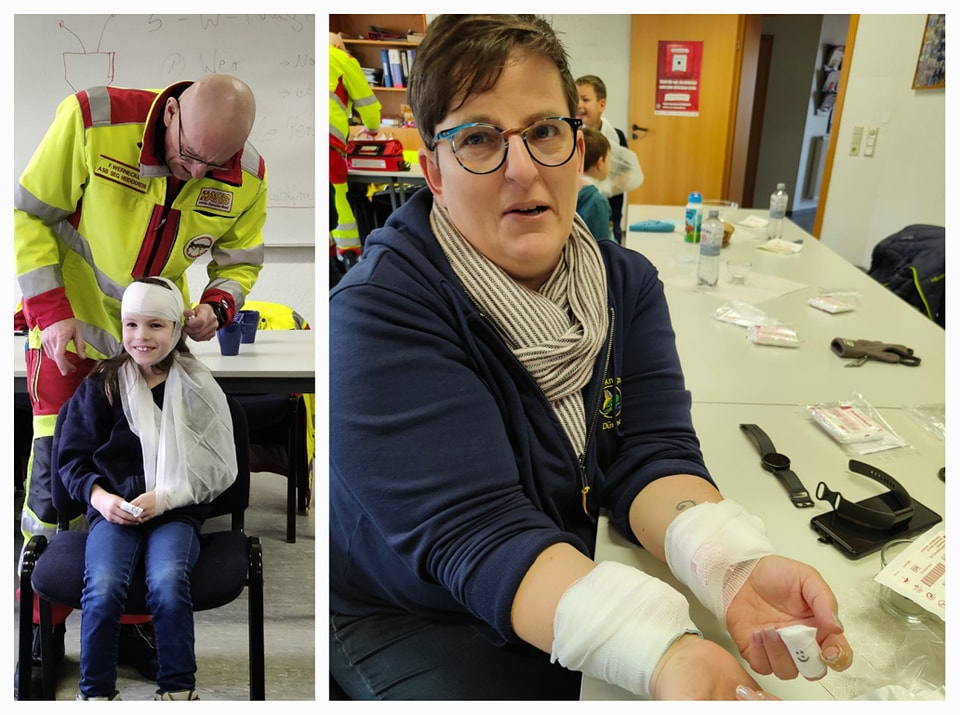 Was ist bei einer Kopfverletzung zu beachten? Wie hält der Verband? Wie stelle ich einen Wundschnellverband für eine Fingerkuppen Verletzung her? Alles wurde perfekt erklärt und ausprobiert. Natürlich konnten die Löschis sich selbst und die Sitznachbarn verarzten. Danke an den ASB für den gelungenen Dienst.